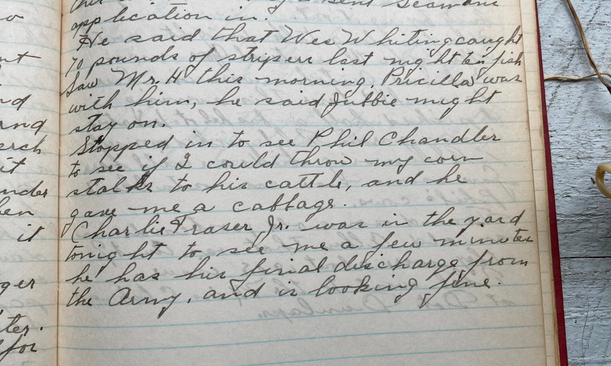 247th day - 118 days to follow Sea Bass Fair and much cooler. Sawed and split kindling all day. Picked 1½ bushels of tomatoes on the hill. Bill Whiting came up on the hill this AM to see if I sent Seamus application in. He said that Wes Whiting caught 10 pounds of stripers last …