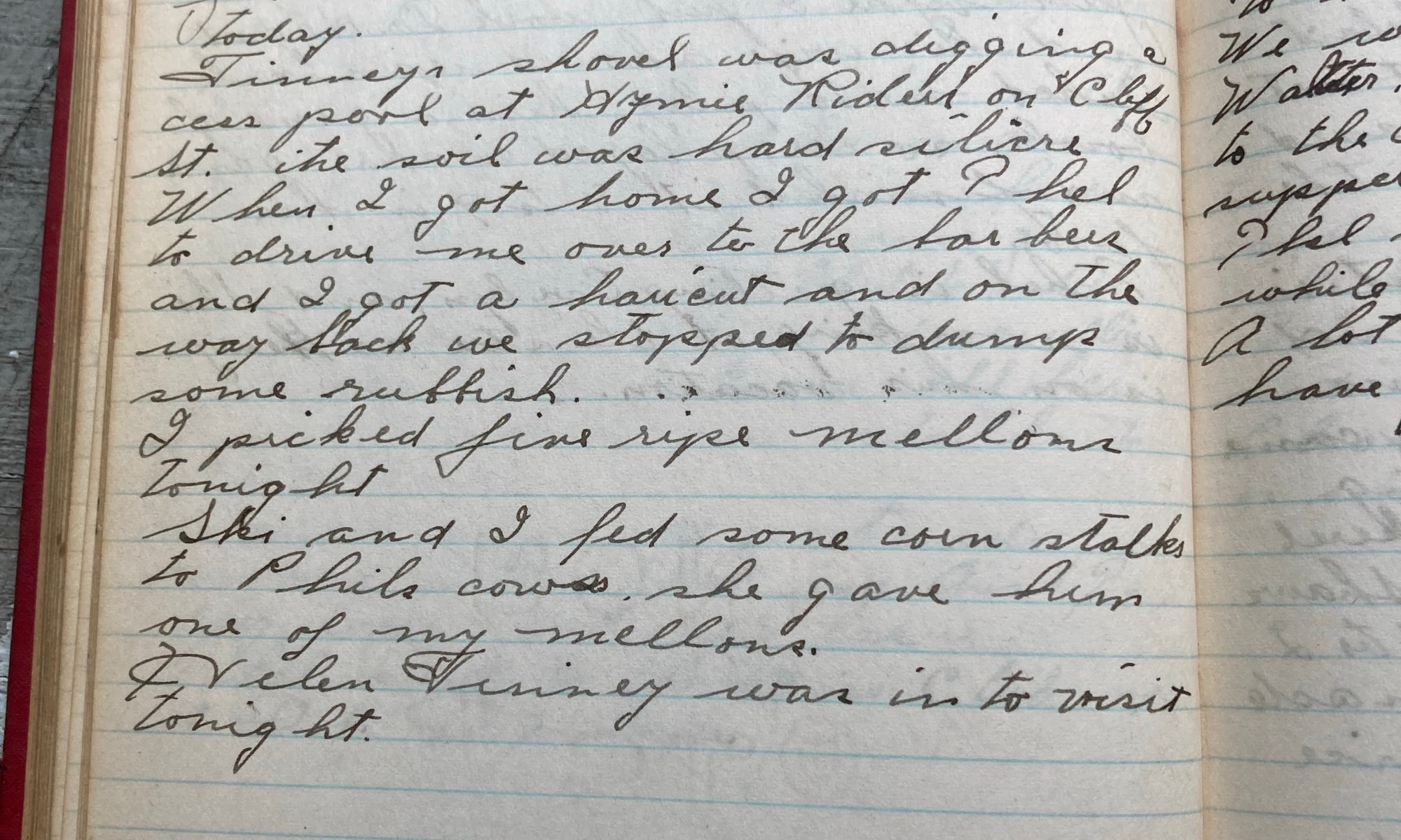 250th day - 115 days to follow Temp 87 Fair and real hot. Mrs H went up to the Country Club and picked some mushrooms. Jubbie came back up on the hill today. Finneys shovel was digging a cess pool at Hymie Riders on Cliff Street, the soil was hard silicre. When I got home …