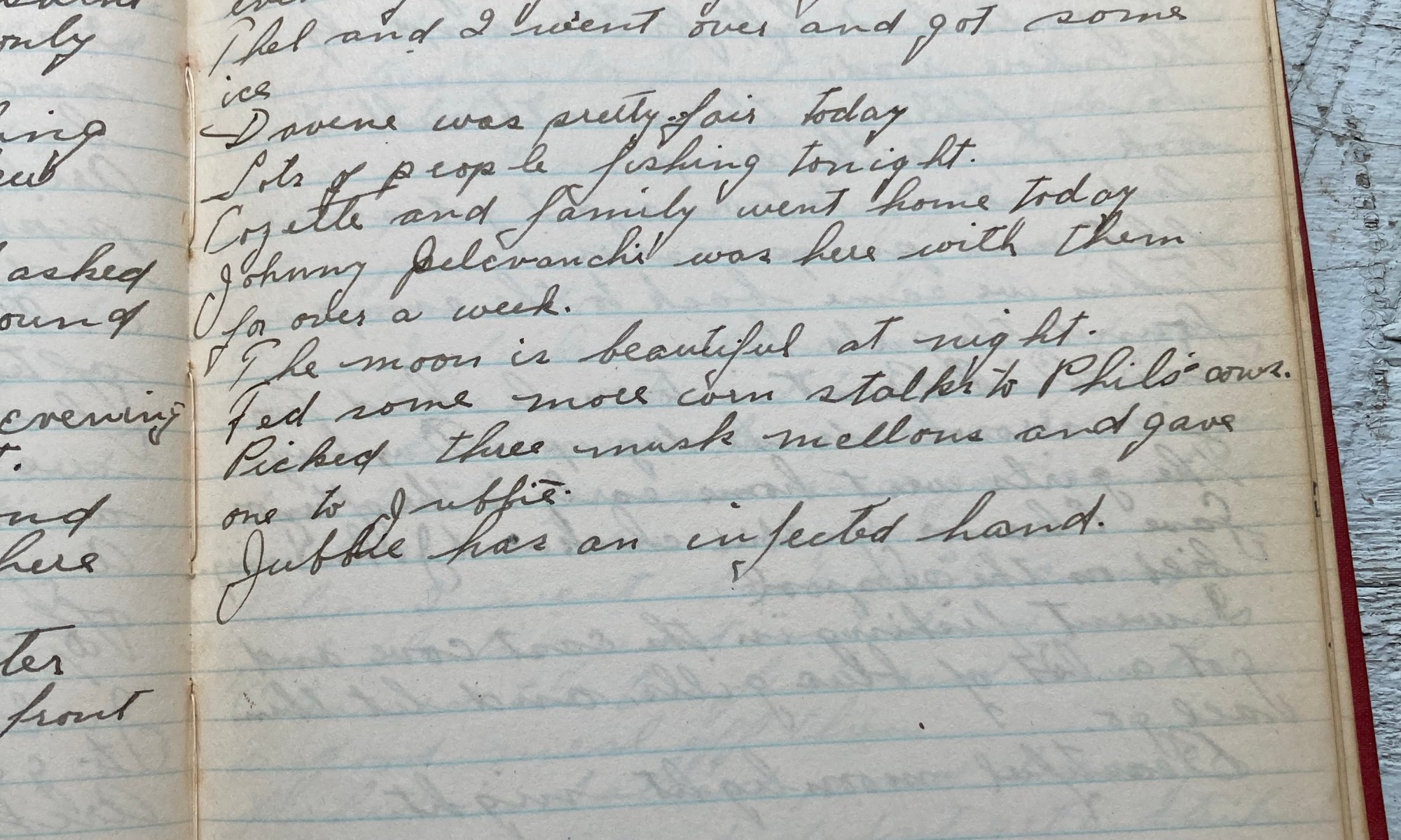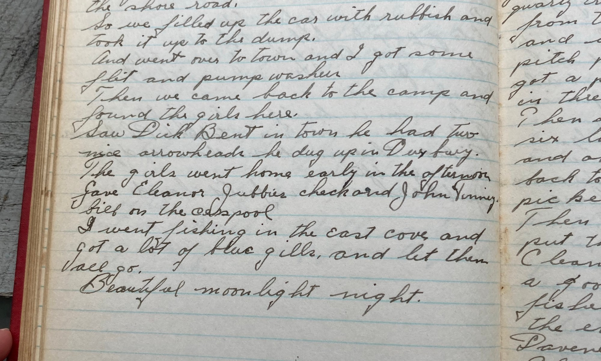 233rd day - 132 days to follow Fair and hot. Painted on the camp all day. Fished for a couple of hours in the evening, caught only a few roaches. Thel and I went over and got some ice. Davene was pretty fair today, Lots of people fishing tonight. Cozette and family went home today. …
