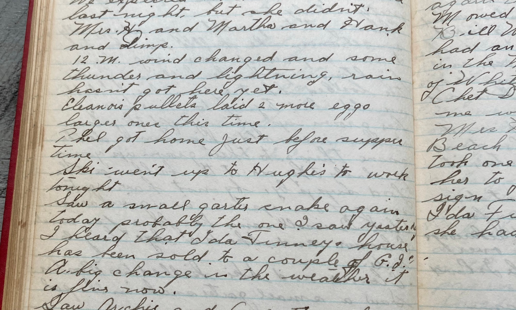 242nd day - 123 days to follow Thel Hot and muggy We expected Thel to come home last night but she didn’t. Mrs H and Martha and Hank and Dimp. 12 m wind changed and some thunder and lightening, rain hasn’t got here yet. Eleanor’s pullets laid 2 more eggs, larger ones this time. THel …
