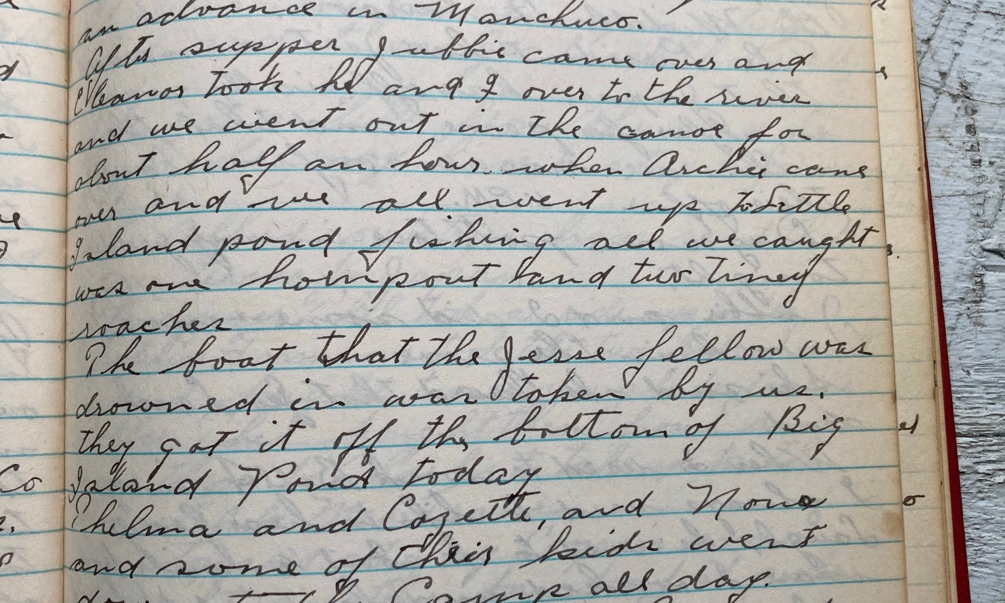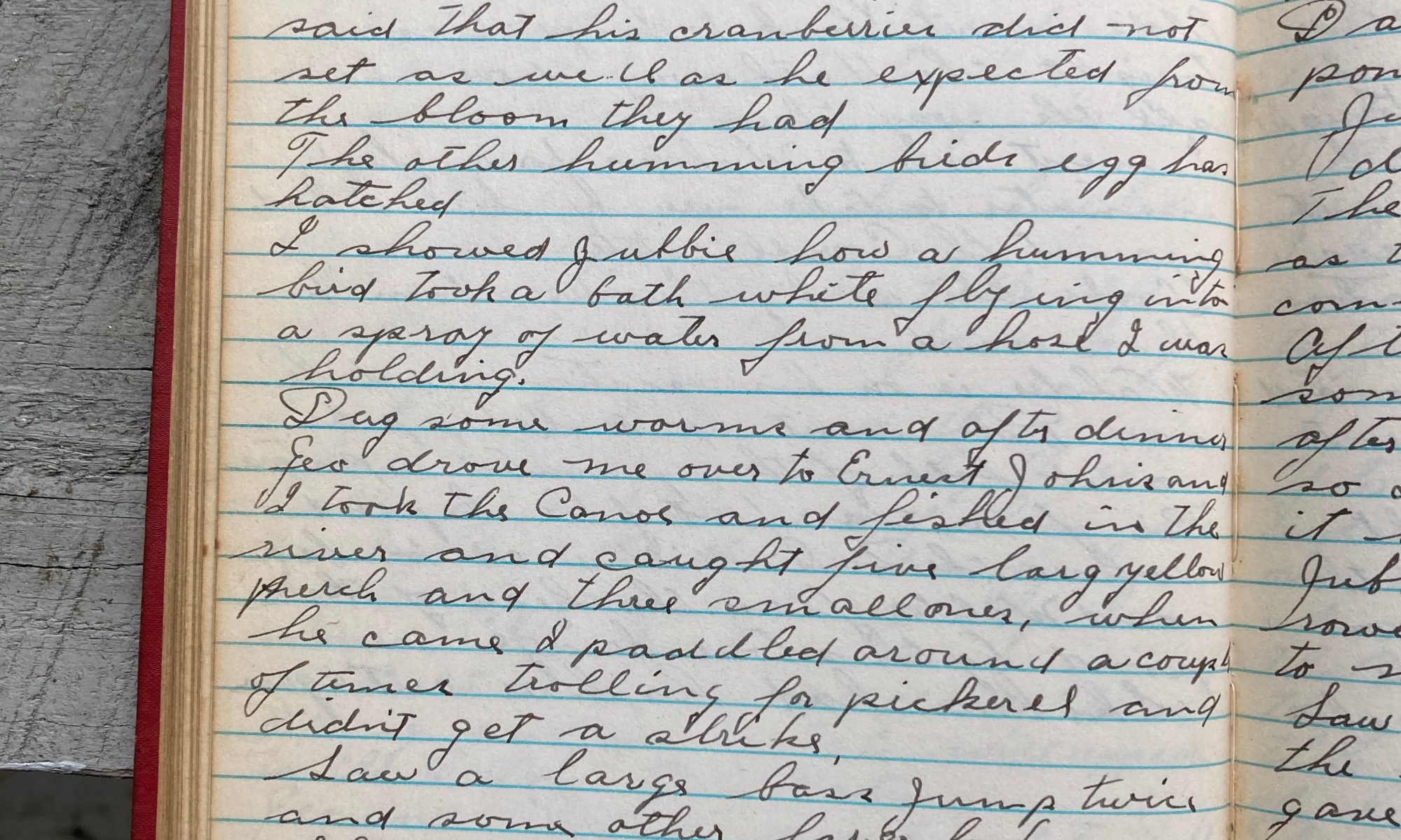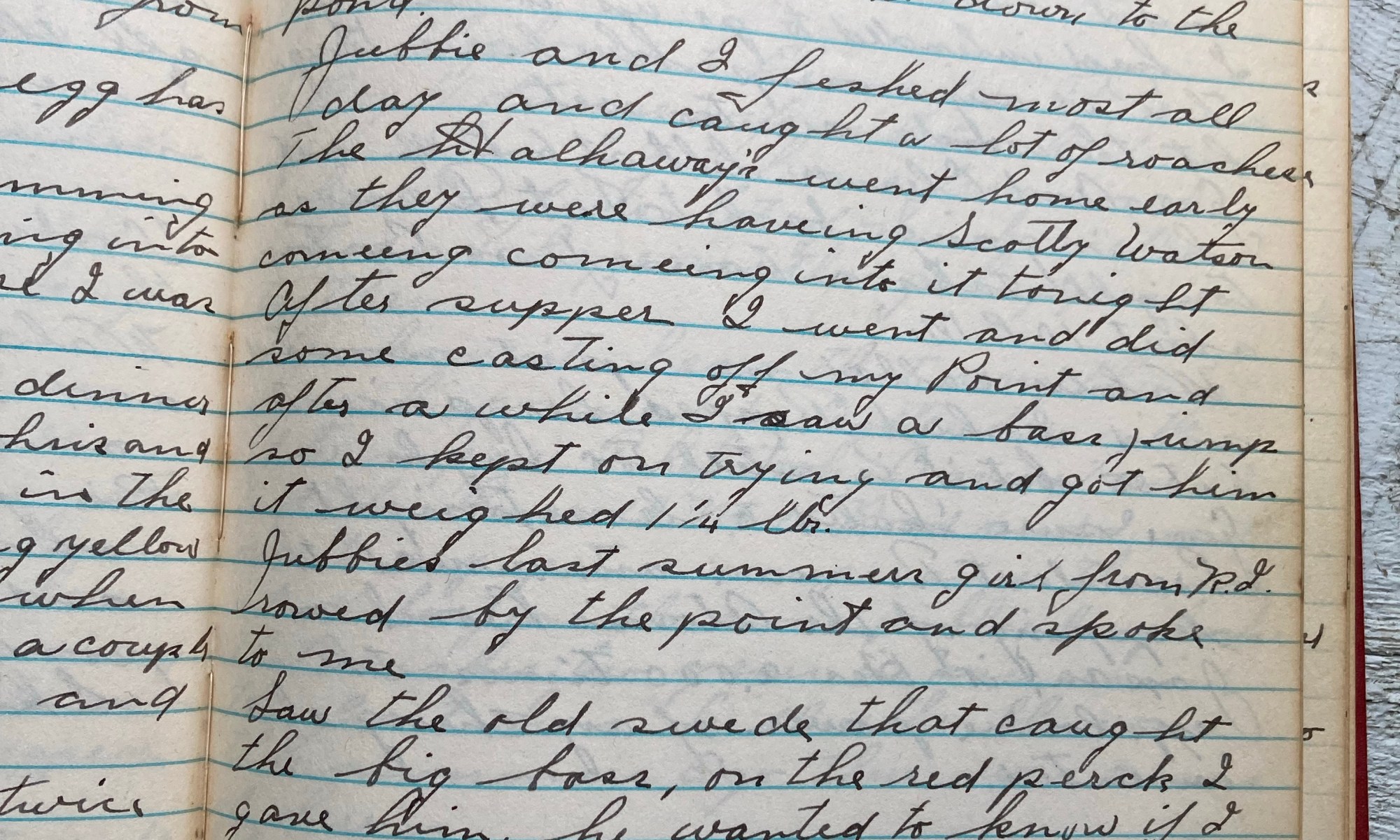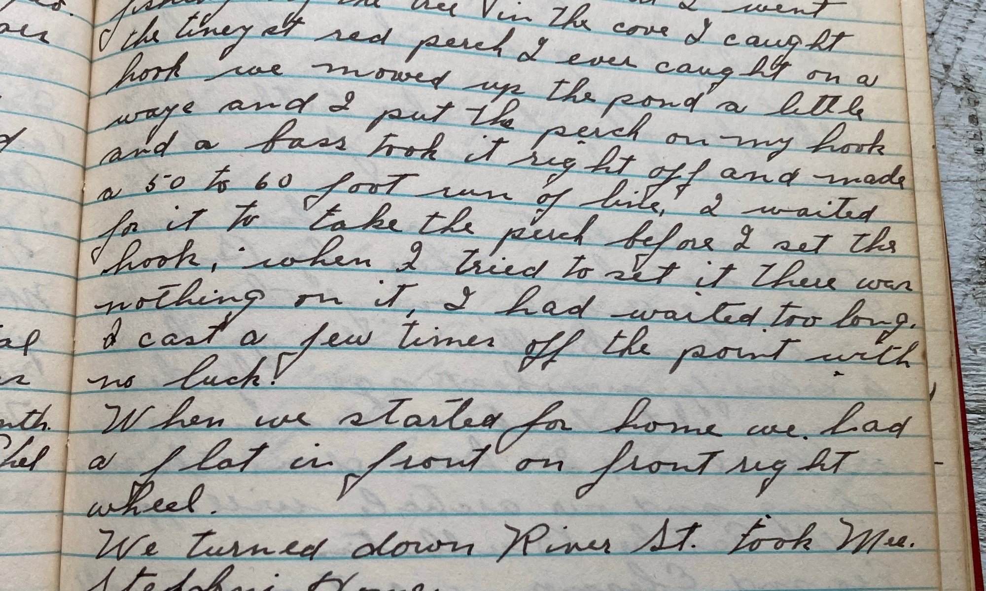 213th day - 152 days to follow Fair and comfortable Did chores all the morning. Mrs H caught a bass yesterday. Tonight Geo, Eleanor, Ski and Georgie went down to the camp and had supper there. After we ate supper Geo and I went fishing by the tree in the cove, I caught the tiniest …