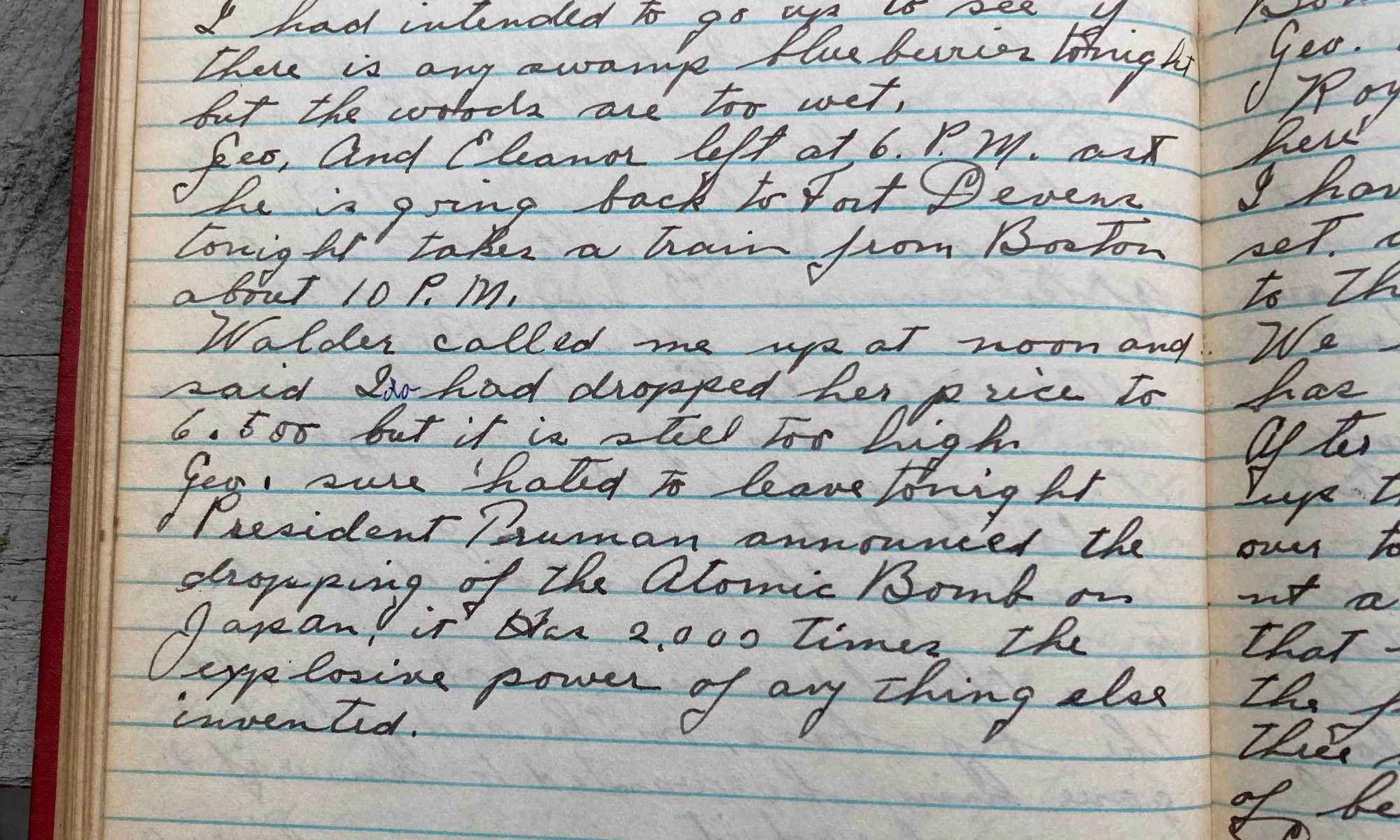 219th day - 146 days to followCool and wet fog and east wind. Jubbie carried coal from the barn to the house cellar. The news is mostly about the Atomic Bomb. Geo telephoned to Eleanor from Ft Devens. Roy Holman’s wife and two kids were here when I got home from work. I have a …
