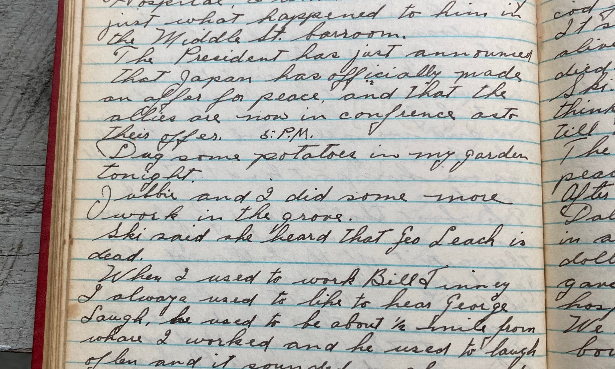221st day - 144 days to follow Fair and warm. Jubbie and I worked in the grove. There was another Atomic bombing of Japan. The Russians have made quite an advance in Manchuco. After supper, Jubbie came over and Eleanor took he and I over to the river and we went out in the canoe …