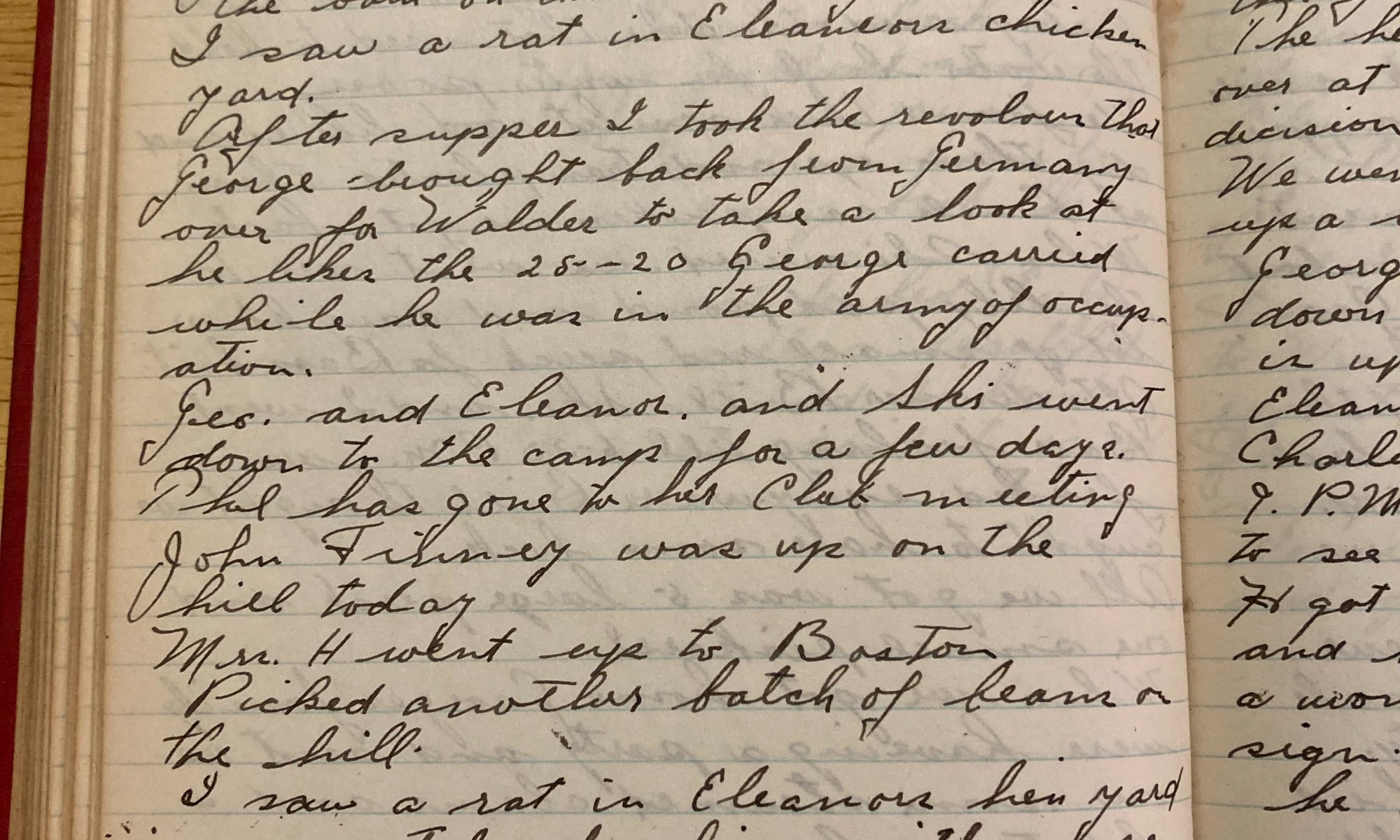204th day - 161 days to follow Freddie Driece was up on the hill today and cleaned out the drains to the cesspool. Jubbie and I worked in back of the barn on the kindling wood. I saw a rat in Eleanor’s chicken yard. After supper I took the revolver that George brought back from …