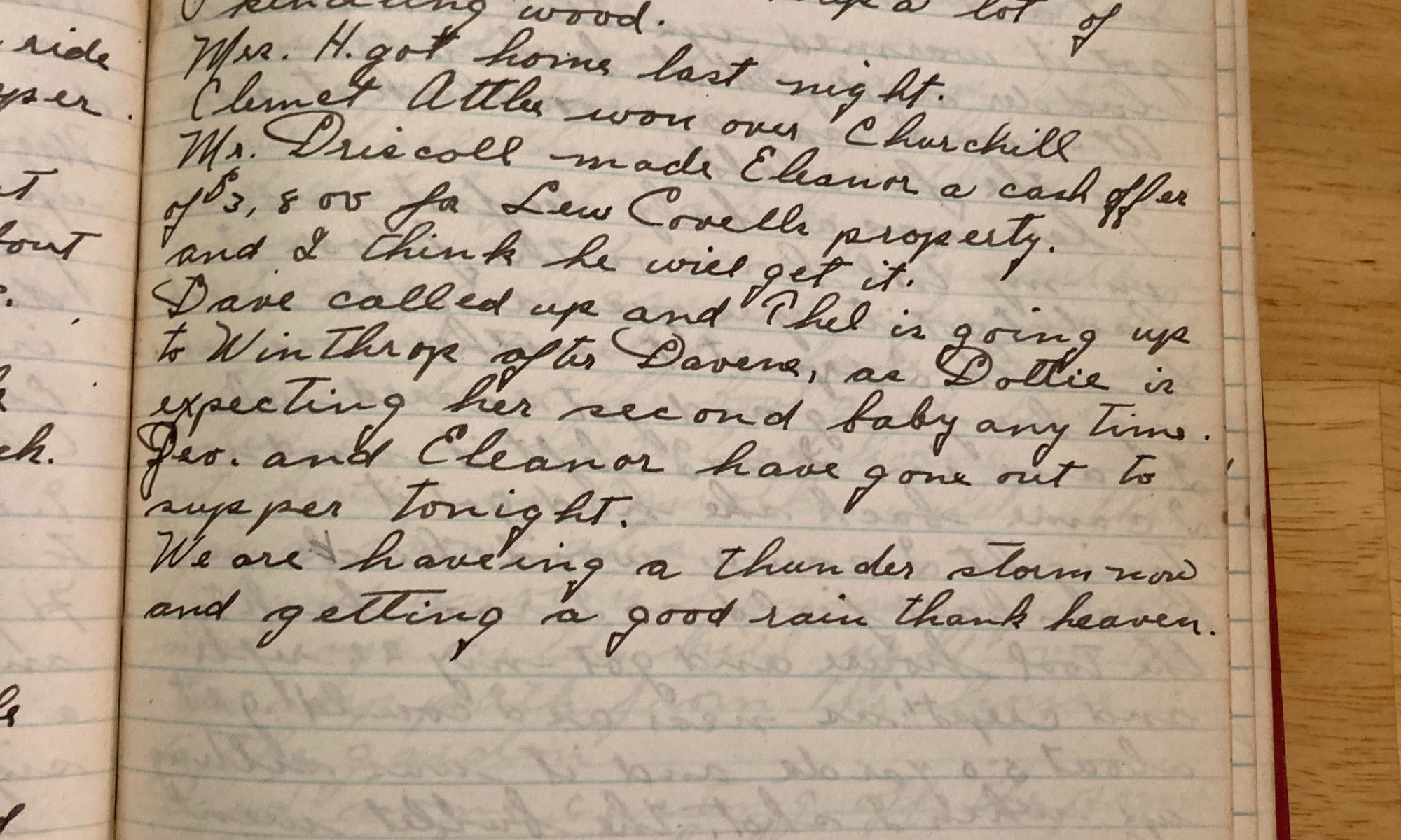 207th day - 158 days to follow Churchill Winston Churchill was defeated in the British elections. Fixed up the swinging doors in the house. Jubbie and I worked up a lot of kindling wood. Mrs H got home last night. Clement Attles was over Churchill. Mr Driscolls made Eleanor a cash offer of $3,800 for …