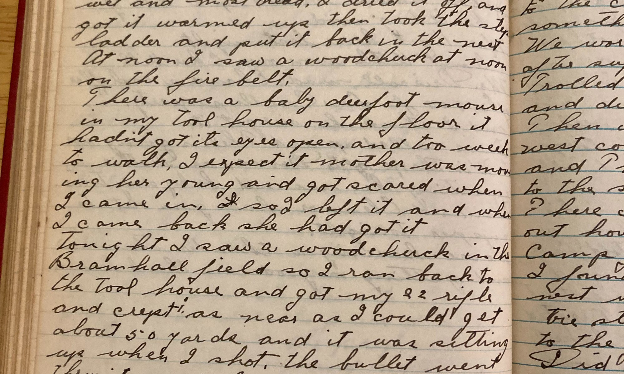 208th day - 157 days to follow Robin weasel mouse woodchuck I saw a weasel on the woodpile in back of the barn so I ran down and got the 410 and shot him. Found a baby robin on the green, all wet and most dead. I dried it off and got it warmed up …