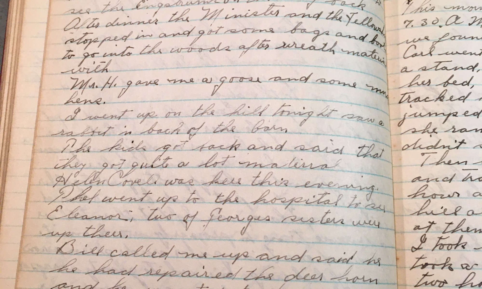 338th day - 28 days follow Went up on the hill and stopped in to see the Engstroms on the way back. After dinner the Minister and the Fellowship stopped in and got some bags and boots to go into the woods after wreath materials with. Mrs. H gave me a goose and some more …