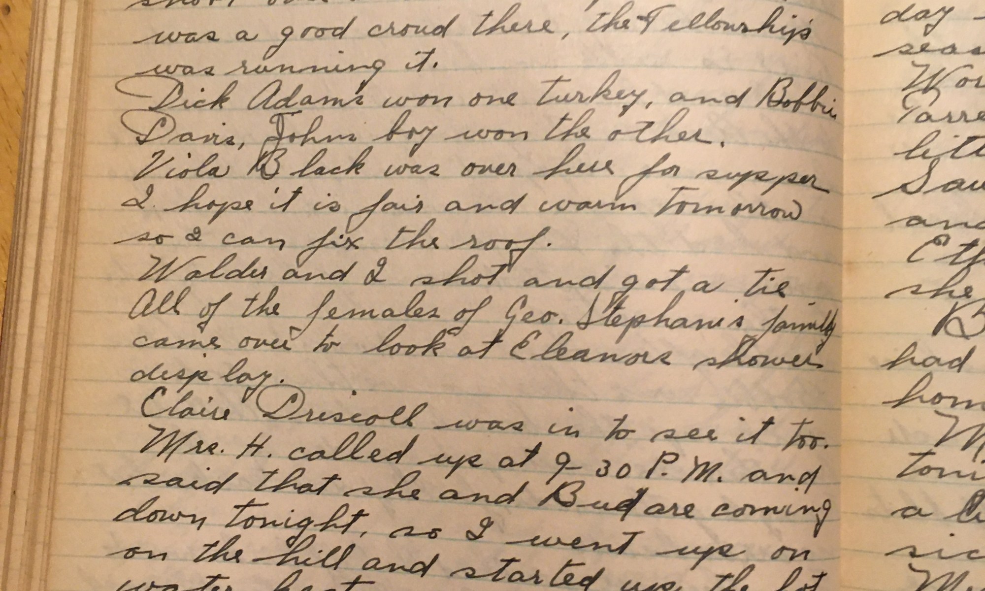 324th day - 42 days follow First fair day for ages. This morning I cleaned the windows and put on the storm windows. This afternoon there was a turkey shoot over at the sand pit, there was a good crowd there, the fellowship was running it. Dick Adams won one turkey and Bobbie Davis, John’s …