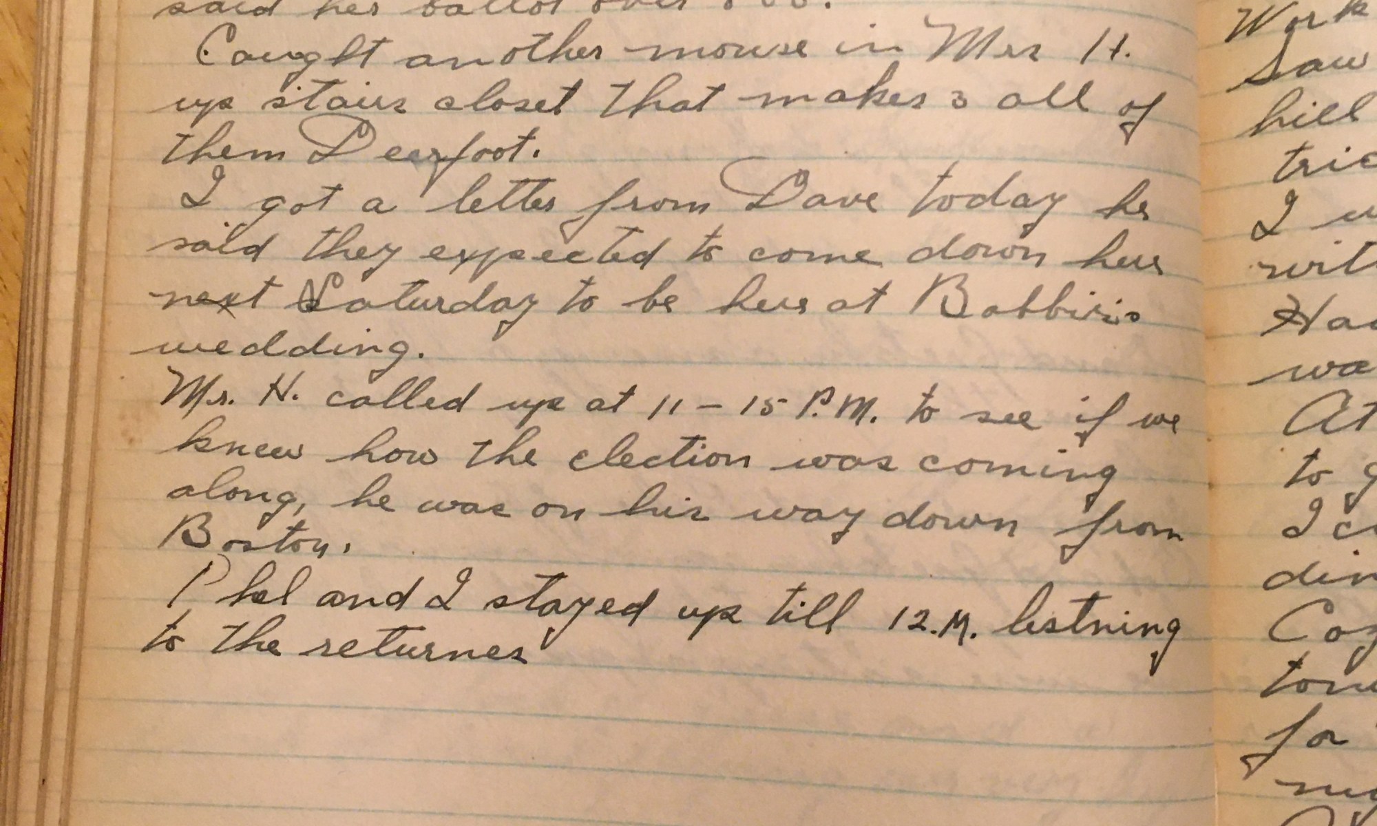 312th day - 54 days follow This is election day. Thel, Eleanor and I went over this morning and cast our ballot, my vote was no. 957. Thel said her ballot was over 800. Caught another mouse in Mrs. H upstairs closet, that makes all of them deerfoot. I got a letter from Dave today, …