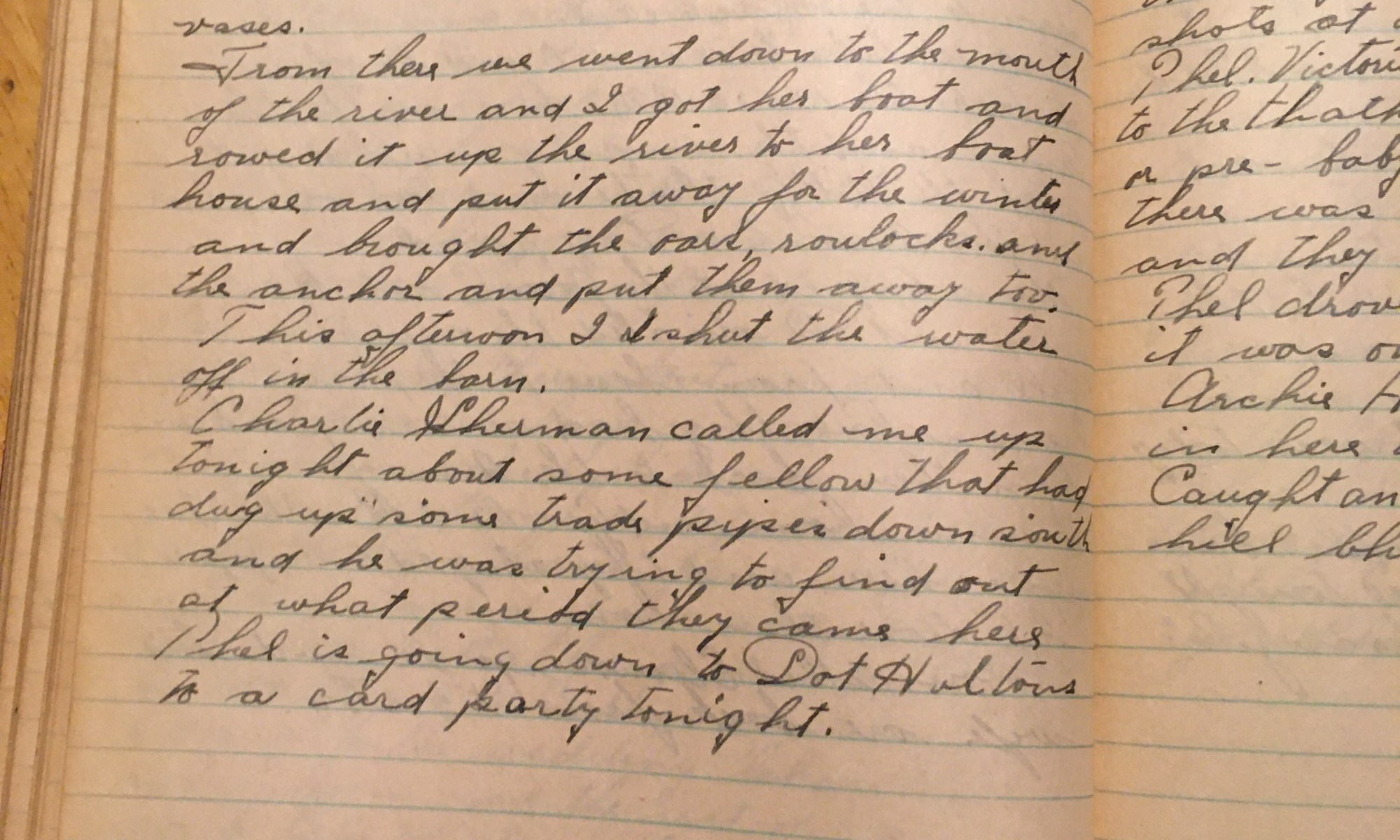 318th day - 48 days follow This morning Mrs. H and I went down to the Beach Club and took out a pair of Andiorns, a metal wood basket and four vases. From there we went down to the mouth of the river and I got her boat and rowed it up the river to …