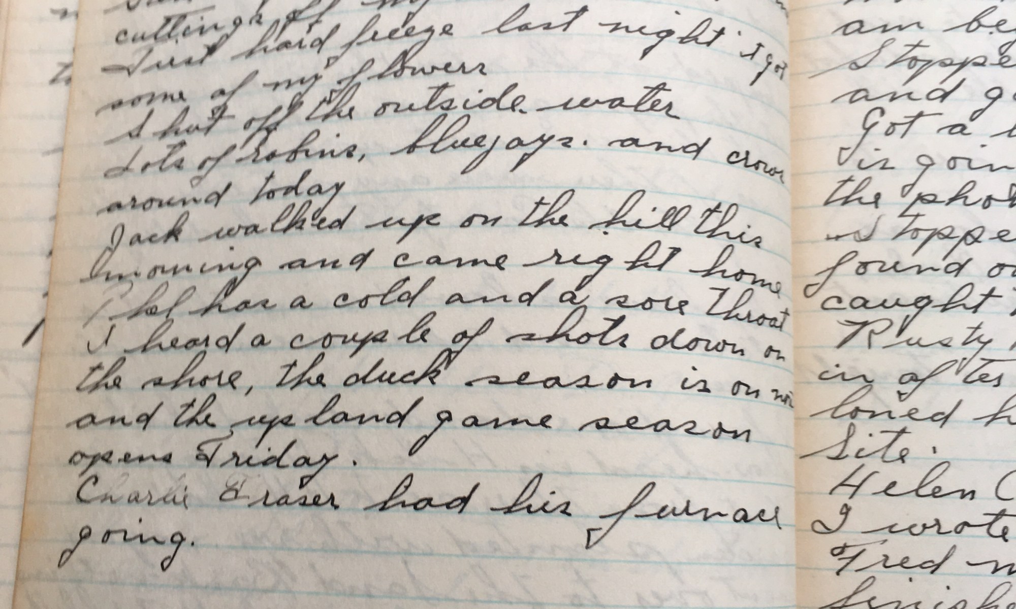 292nd day - 74 days follow Chopped trees and dug roots clean of dirt in blown over trees. Mrs. H is back from the island and had two ducks for me to pick. She had a dead hawk she had shot. Jack took a walk up on the hill this afternoon. Eleanor gave me a …