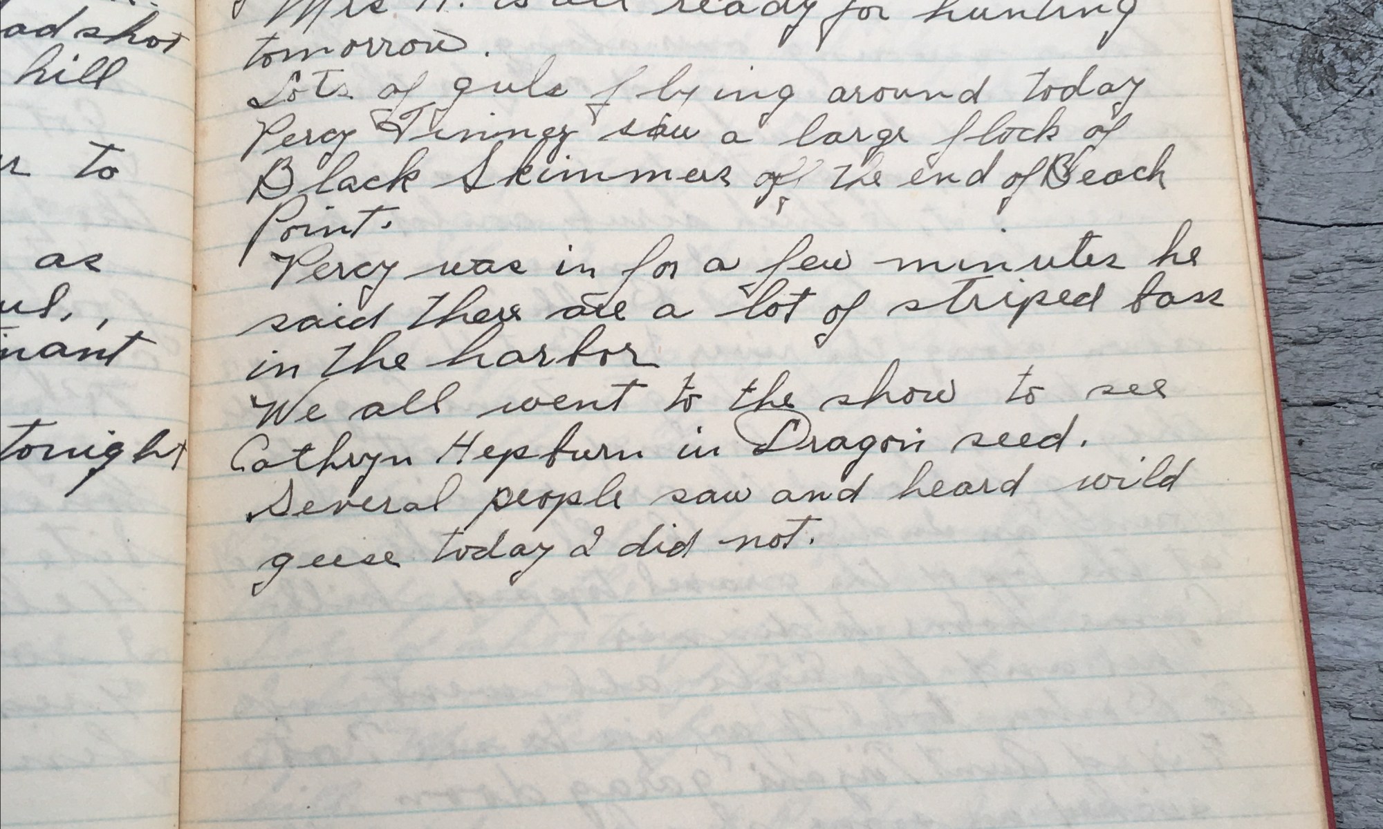 293rd day - 73 days follow Knocked the earth off the roots of the tree that blew down. Ground both of my axes. Mrs. H is all ready for hunting tomorrow. Lots of girls flying around today. Percy Finney saw a large flock of Black skimmers off the end of Beach Point. Percy was in …
