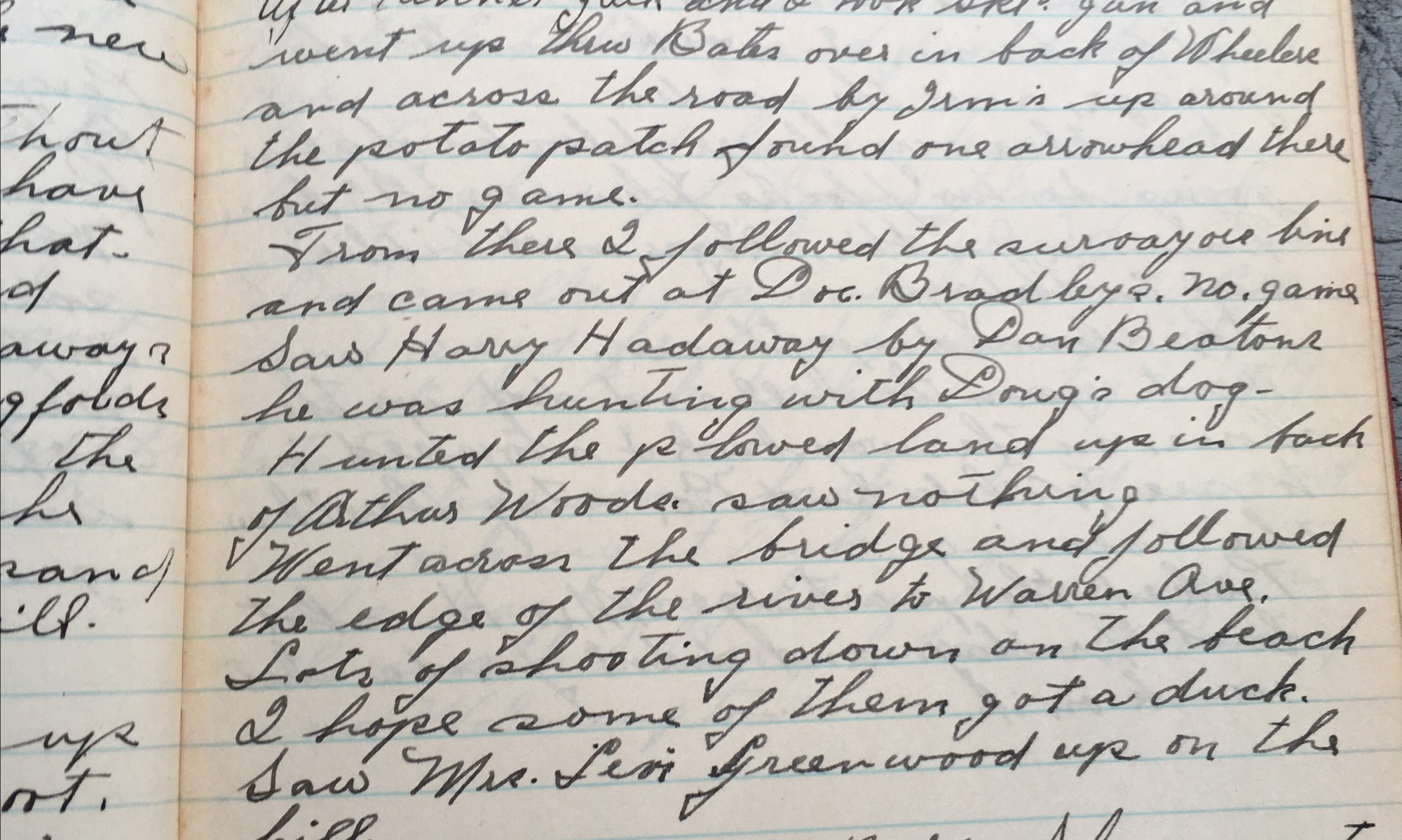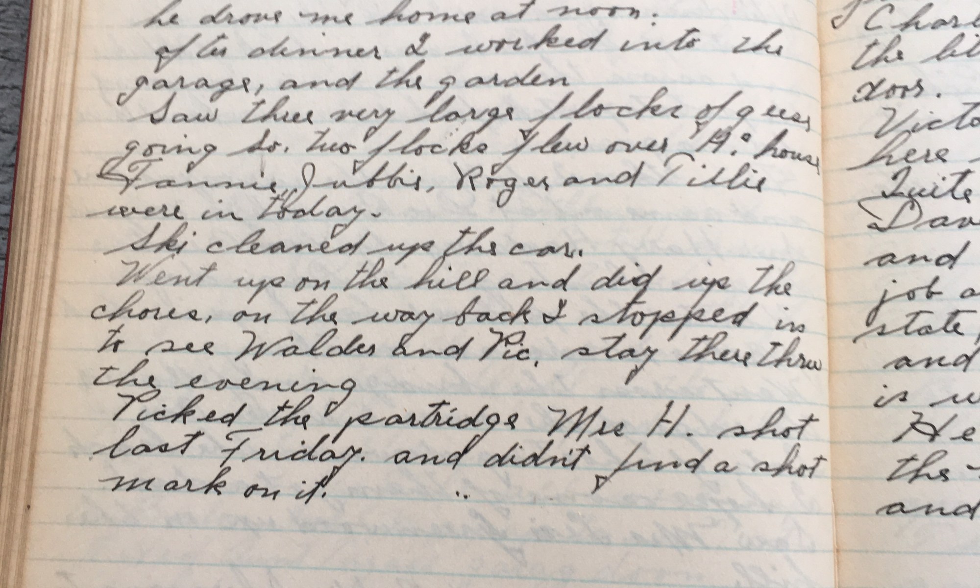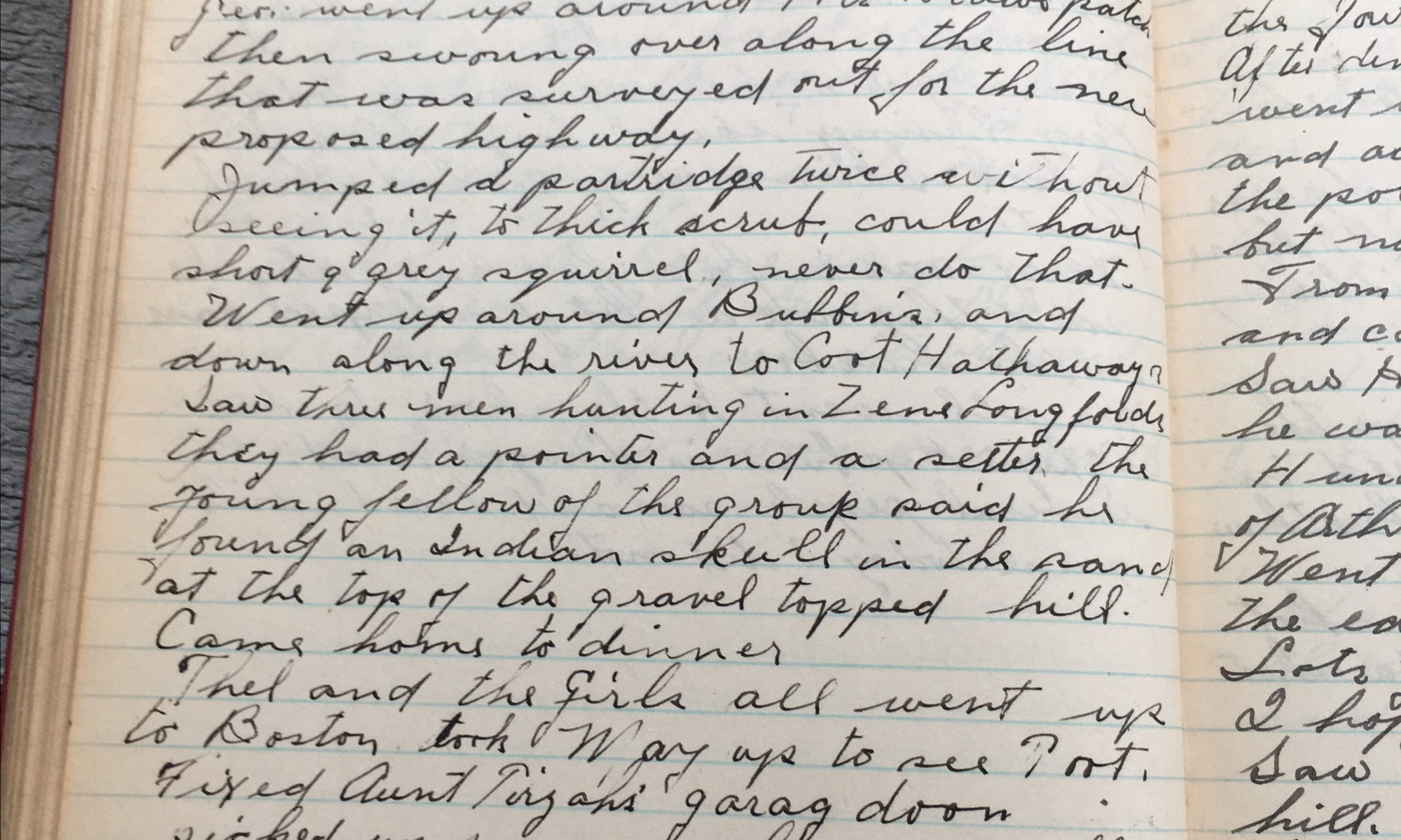 294th day - 72 days follow This morning I took my gun and went thru Hartwells over in back of Huck’s and across the road by Geo Warde, saw Geo, went up around his potato patch then swung over along the line that was surveyed out for the new proposed highway. Jumped a partridge twice …