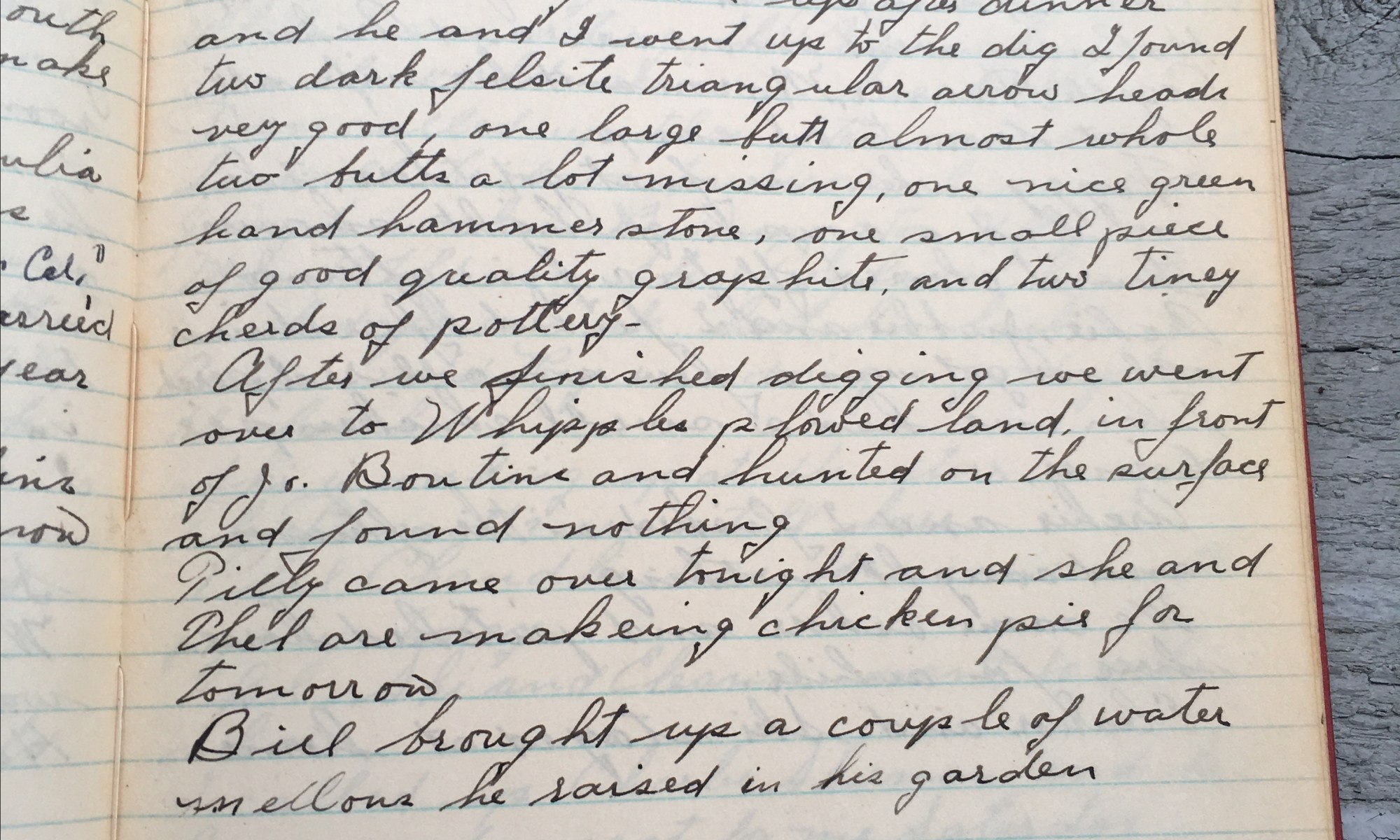 281st day - 85 days follow Arrowheads Fair and very warm today. Stopped in to see Puc and Eric on my way home at noon, they are O.K. now. Gave Archie some apples. Bill Whiting came up after dinner and he and I went up to the dig, I found two dark felsite triangle arrowheads, …