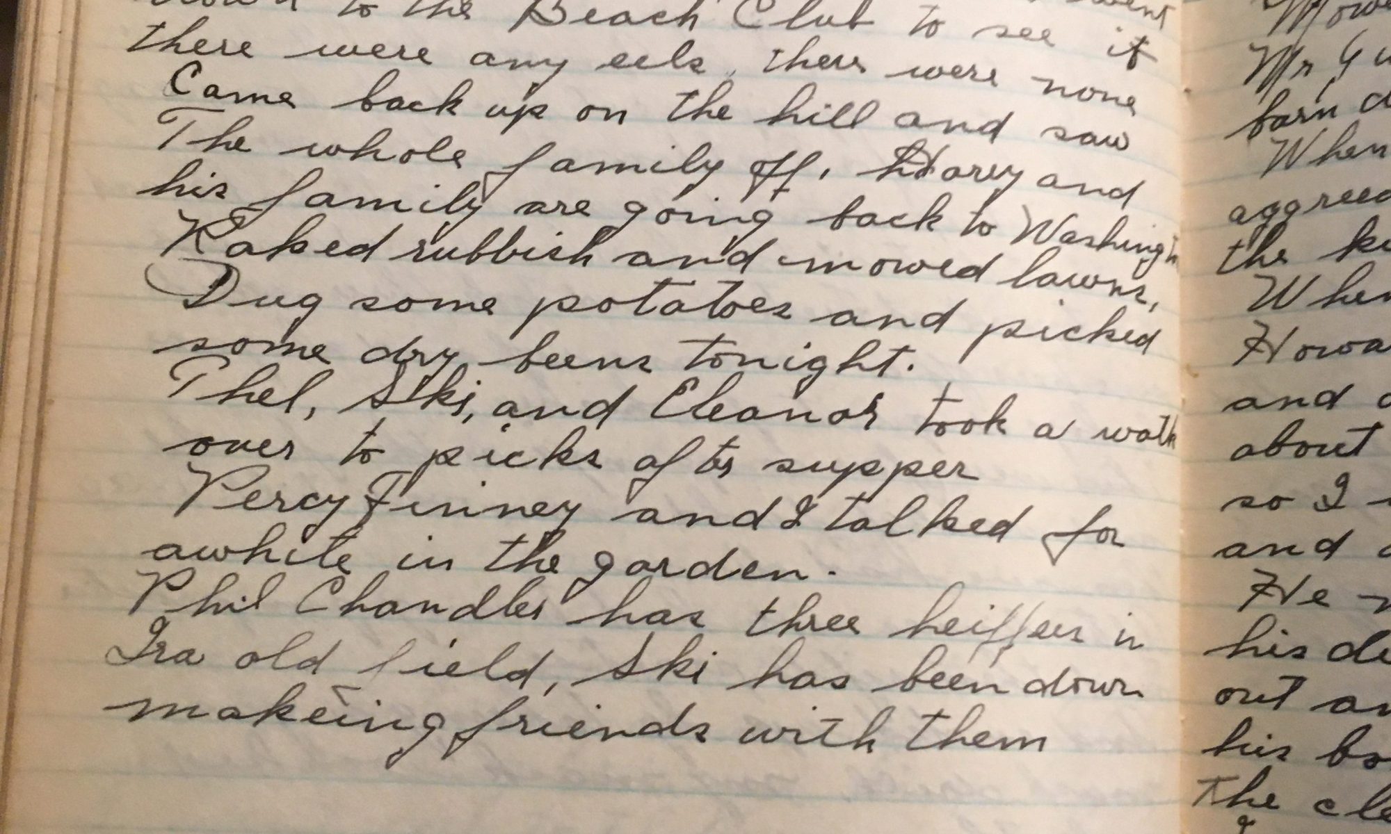 262nd day - 104 days follow Harry, his father, Martha and I went down to the Beach Club to see if there were any eels there were none. Came back up on the hill and saw the whole family off. Harry and his family are going back to Washington. Raked rubbish and mowed lawns. Dug …