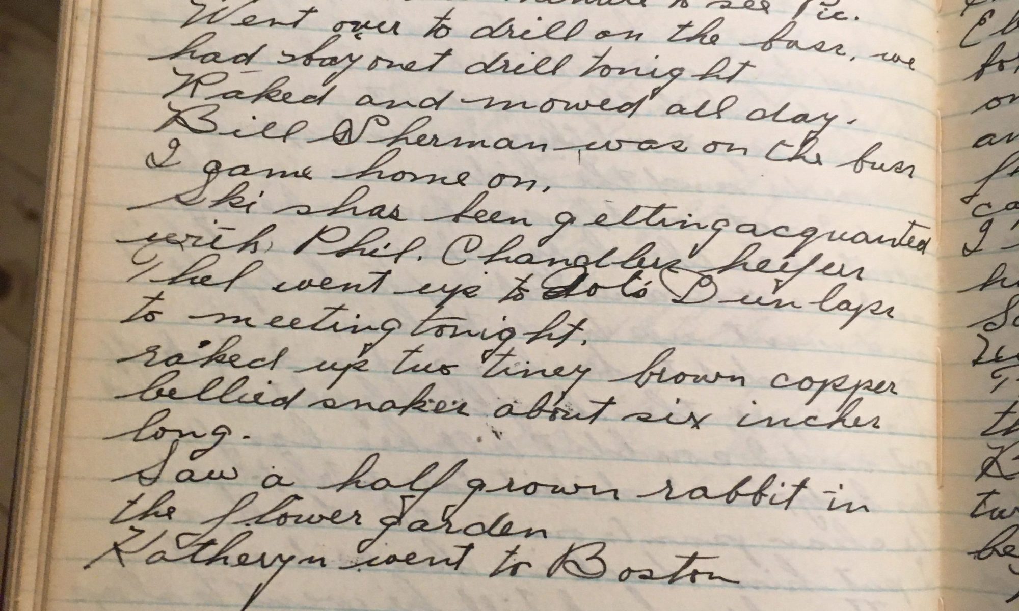 264th day - 102 days follow Took a look in the eel traps this morning, nothing in it. Stopped in a minet to see Pic. Went over to drill on the base, we had bayonet drill tonight. Raked and mowed all day. Bill Sherman was on the bus I came home on. Ski has been …