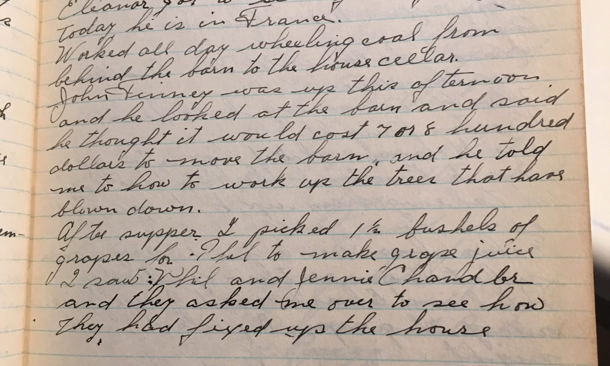 269th day - 97 days follow First Frost First hard white frost this morning. Went down to the eel trap, nothing in it again. Eleanor got a letter from George today he is in France. Worked all day wheeling coal from behind the barn to the house cellar. John Finney was up this afternoon and …