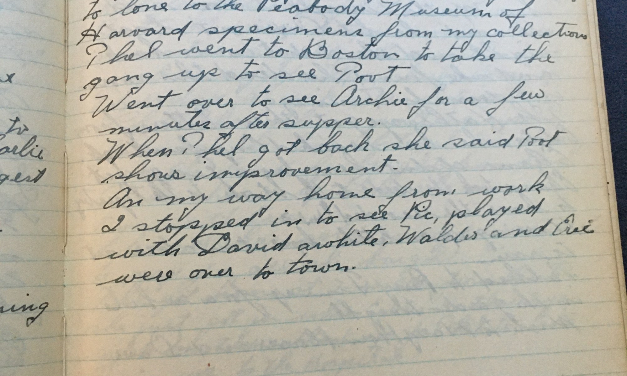 238th day - 128 days follow Fair Cool Went up on the hill and did the chores then came home and dressed up and packed my specimens to take up to the Peabody Museum in Cambridge. THen we went over and picked up May and went up to Whitman and picked up Millie and …