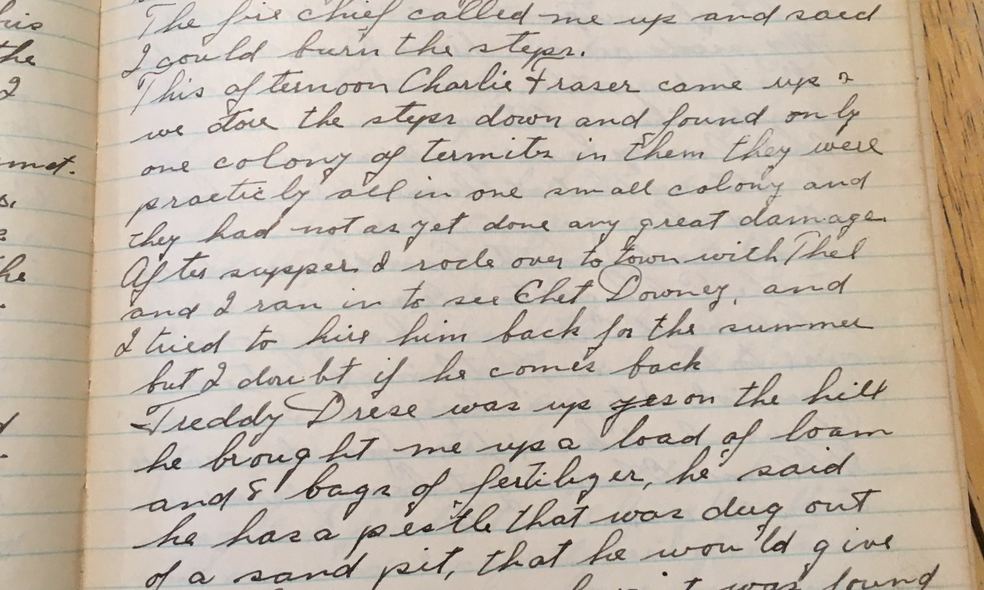 101st day – 265 days follow 60 Fair Dog tax Went up on the hill and got Martha’s text books, took them to town and mailed them. Paid the dog tax. Bought $1.80 onion sets. Called up John Finney about the drive and some fertilizer. The fire chief called me up and said I could …
