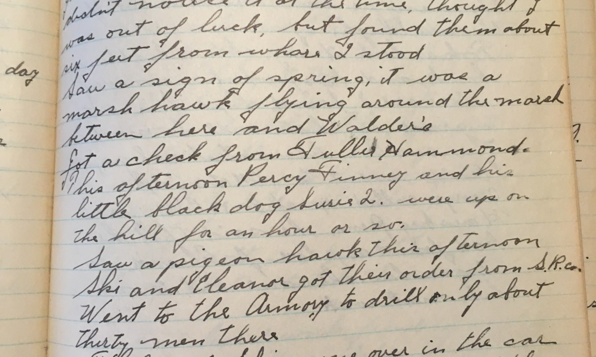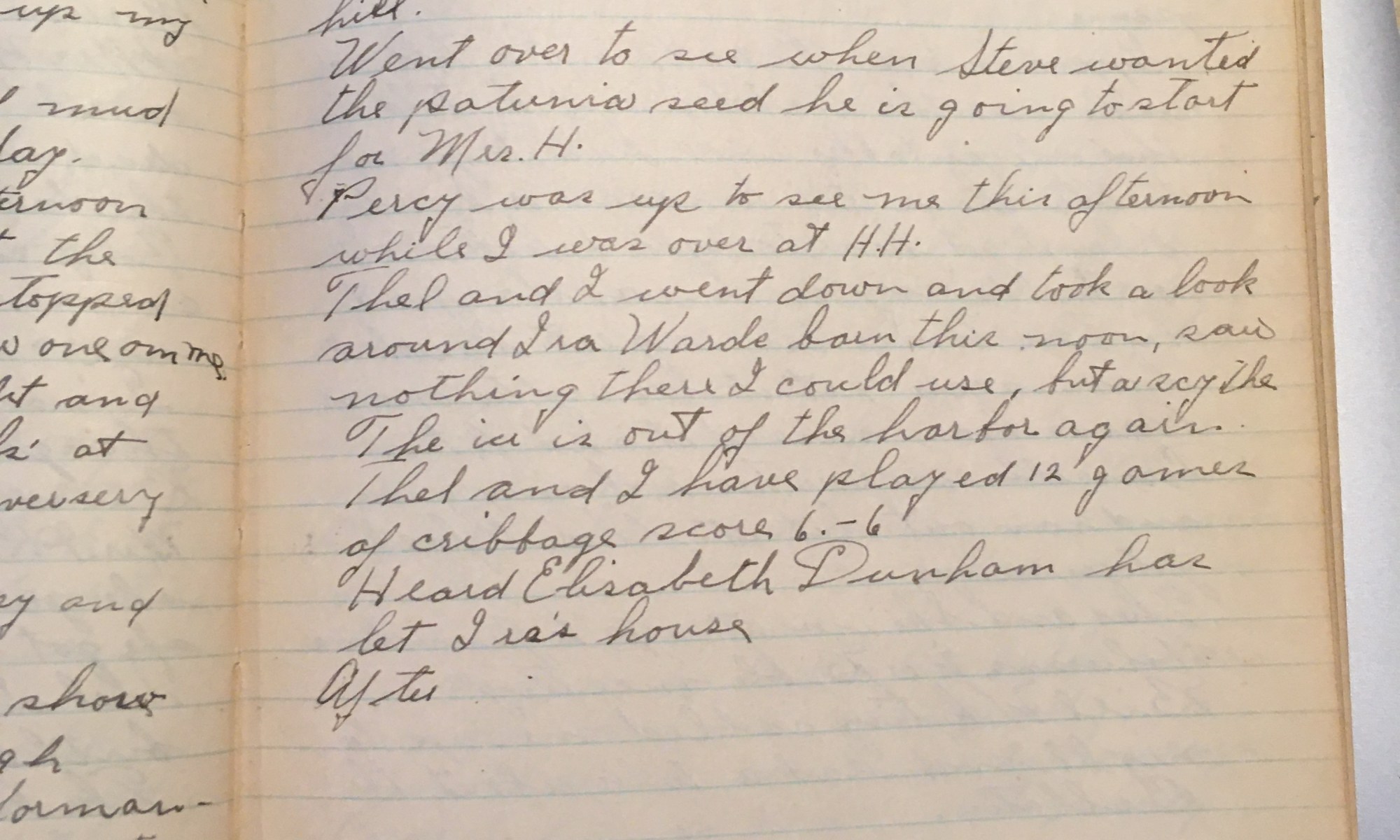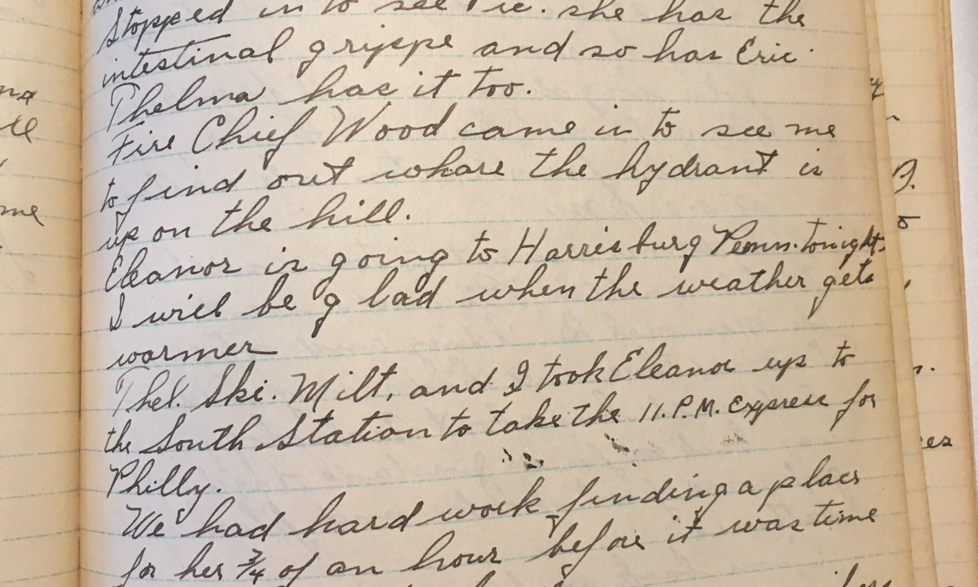 63rd day – 303 days follow 32 Partly Cloudy Got the house in the weekend shape for the folks. Mrs. H called up at noon and said she and Mr. H will be down tonight and the rest of tomorrow. Stopped into see Pic. She has the intestinal grippe and so has Eric. Thelma has …