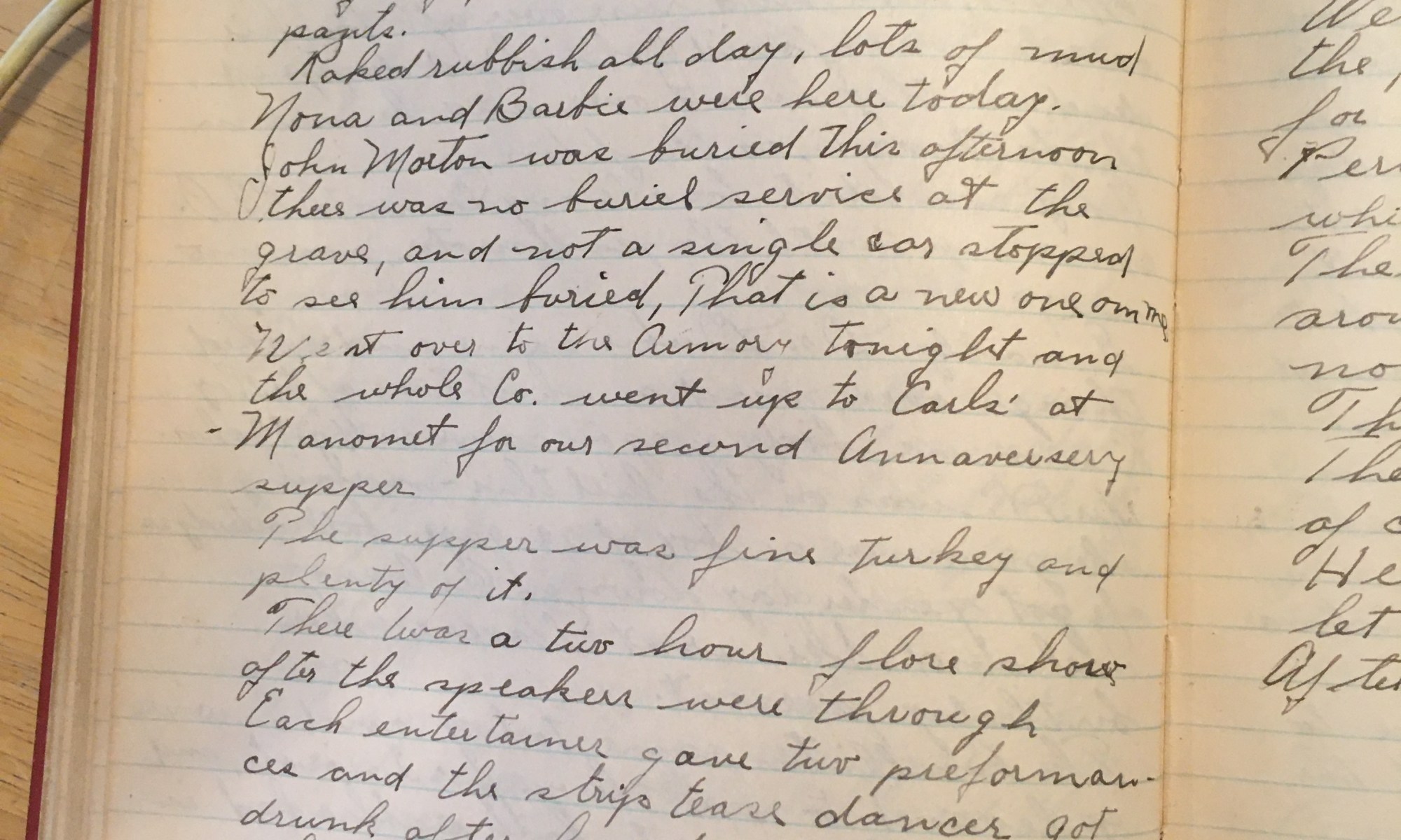 68th day – 298 days follow 40 Fair John Morton, M.S.G., Ann Dapper So far this winter there have been three deaths on Cliff St, all on the east end, and in adjacent homes. Thel found my pocket book, it had dropped out of my pocket when I hung up my pants. Raked rubbish all …
