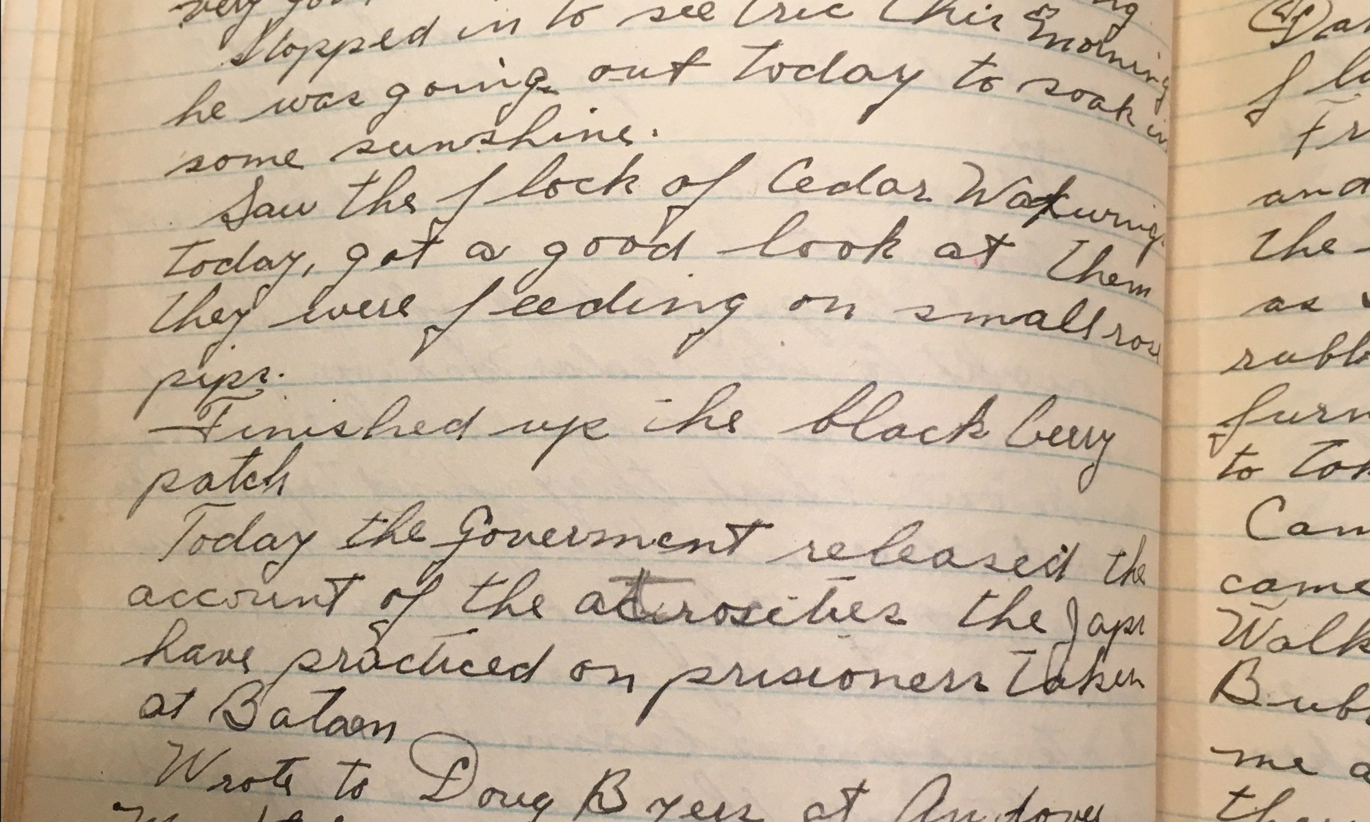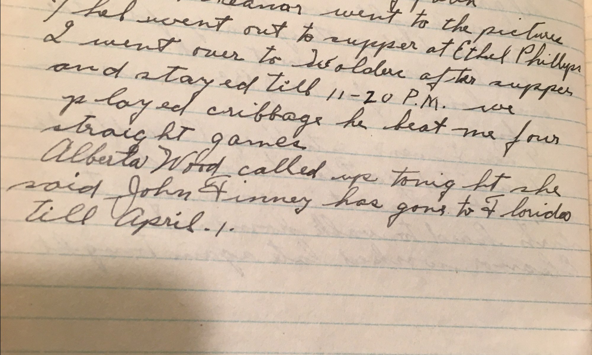 20th day – 346 days follow 33 cloudy Mild weather, foggy with So wind. Worked on the blackberry patch. Ski and Eleanor went to the pictures. Thel went out to supper at Ethel Phiilips. I went over to Walders after supper and stayed till 11-20 PM. We played cribbage, he beat me four straight games. …