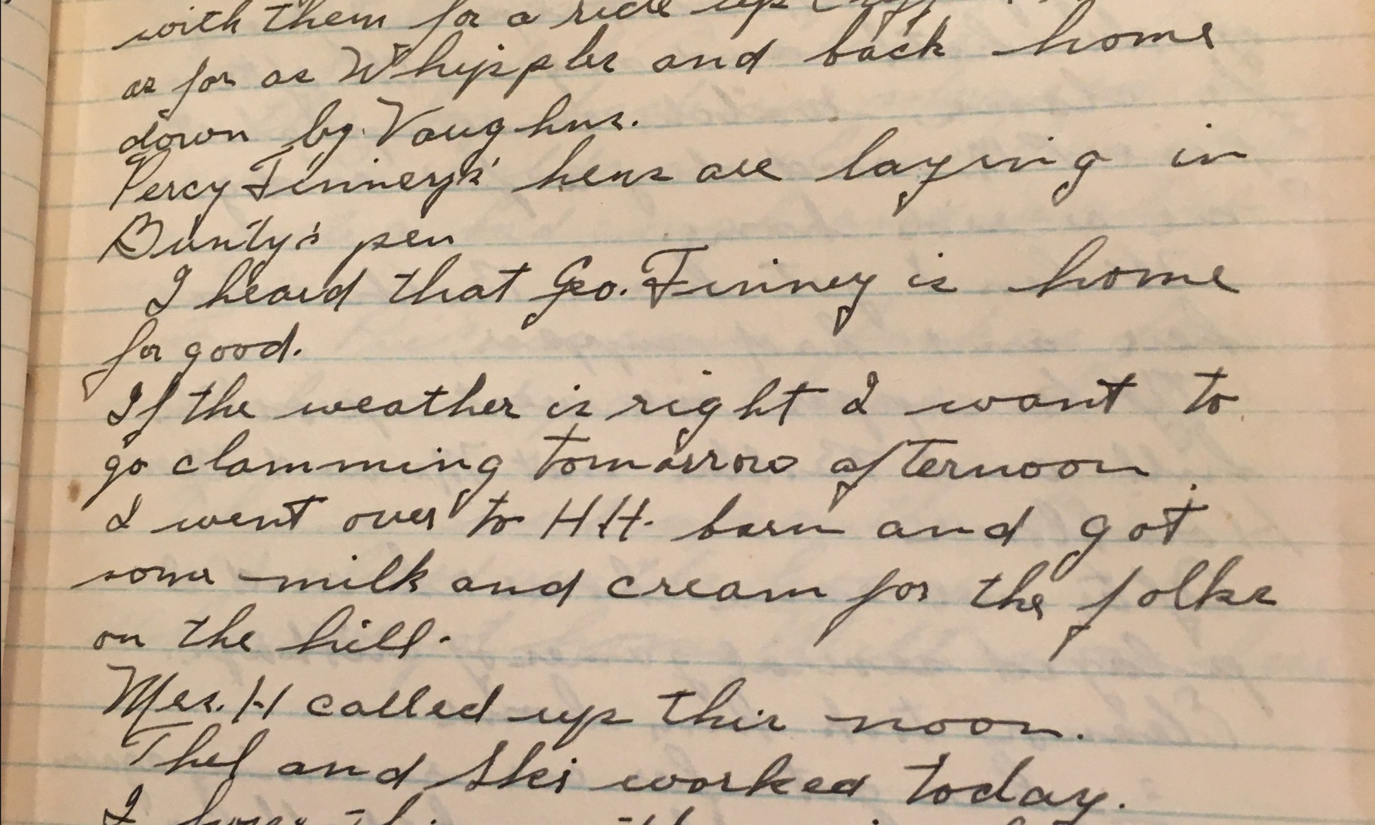 24th day – 342 days follow 34 Fair Fair and warm wind North. Thel took a bunch of Pythian Sisters down to Fall River to a convention. Percy Finney told me his brother George is almost blind in his right eye. Eleanor came home to supper then went back to work. We had steamed clams …
