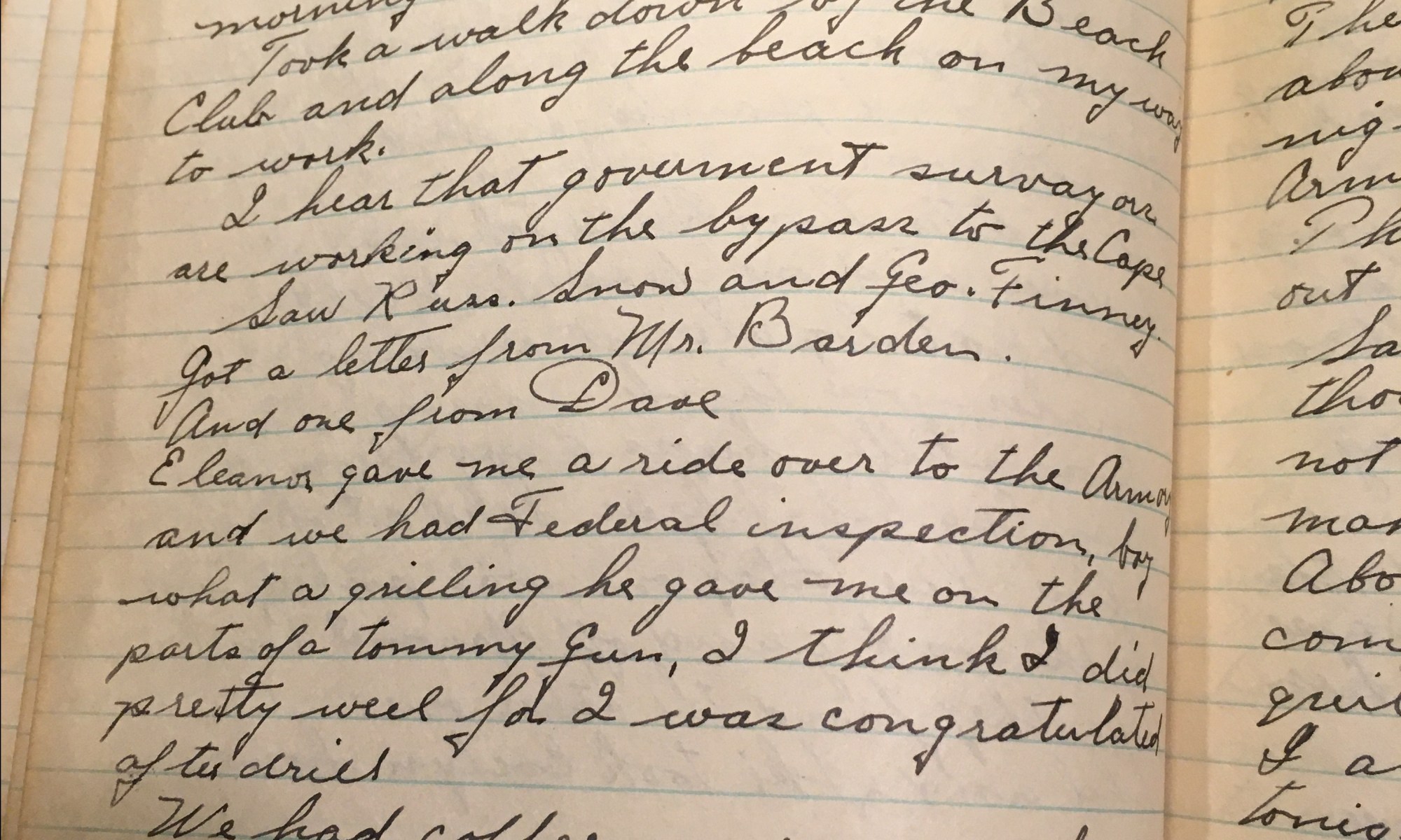 26th day – 340 days follow 36 Cloudy Eleanor typed out my article on archaeology and took it to mail this morning. Took a walk down by the Beach Club and along the beach on my way to work. I hear that government surveyors are working on the bypass to the Cape. Saw Russ Snow …
