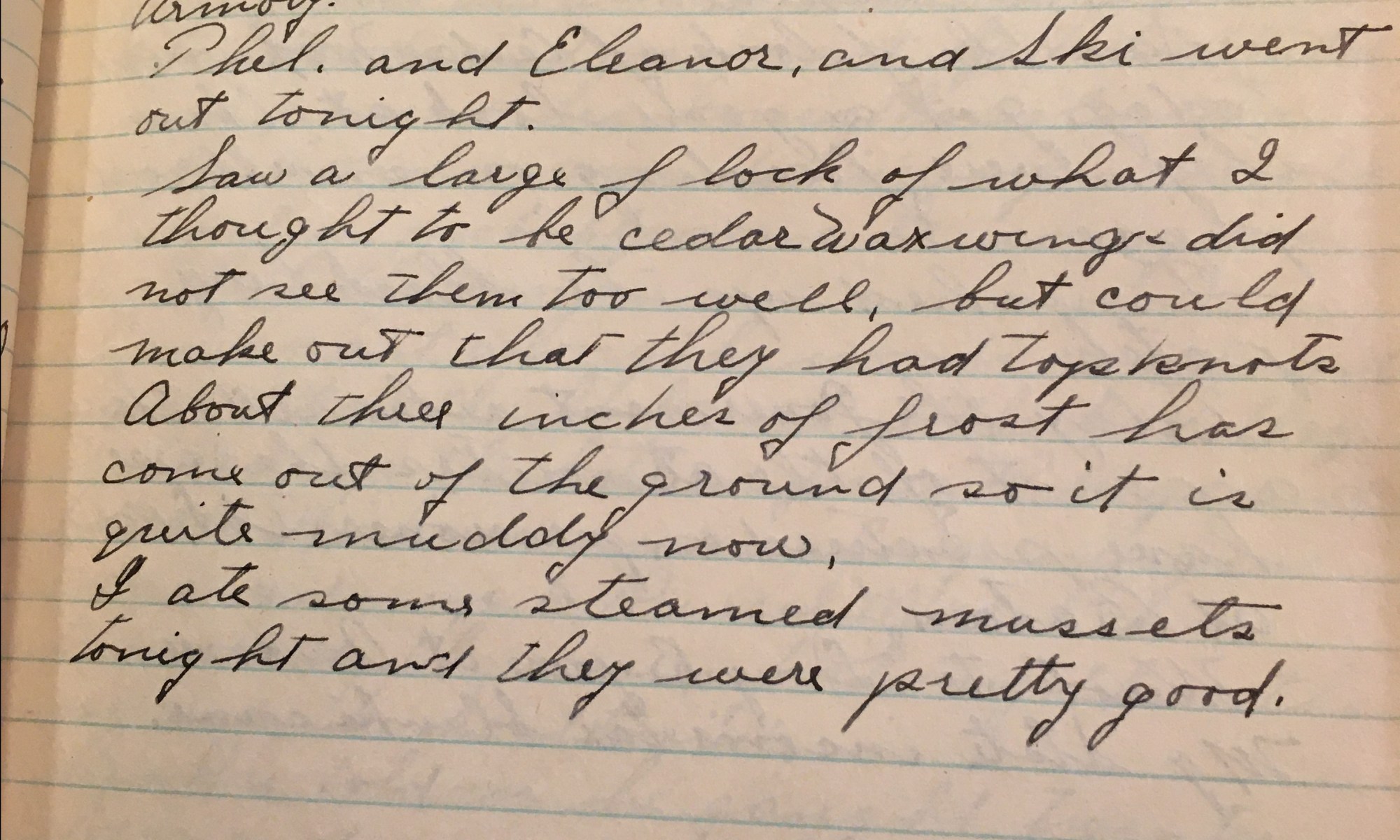 27th day – 339 days follow 54 Fair This has been the warmest day so far this year. The Old Colony had a long story about how well we did last night during inspection at the Armory. Thel and Eleanor and Ski went out tonight. Saw a large flock of what I thought to be …