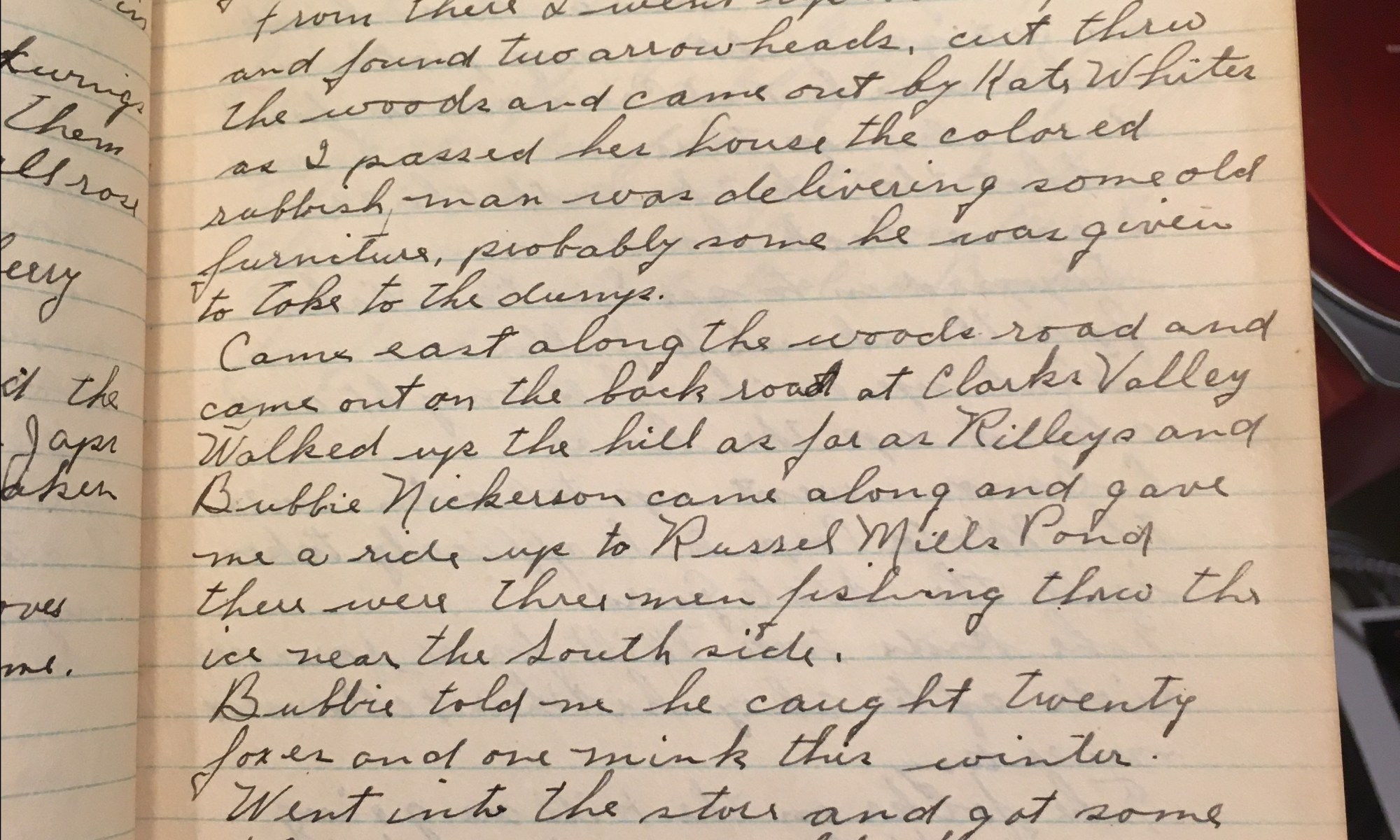 29th day – 337 days follow 36 Fair Got the house ready for the folks. After dinner I took a walk over to Huck Davis’s garden, nothing there but a few flakes. From there I went up to Ira’s pastures and found two arrowheads, cut thru the woods and came out by Kate Whites, as …