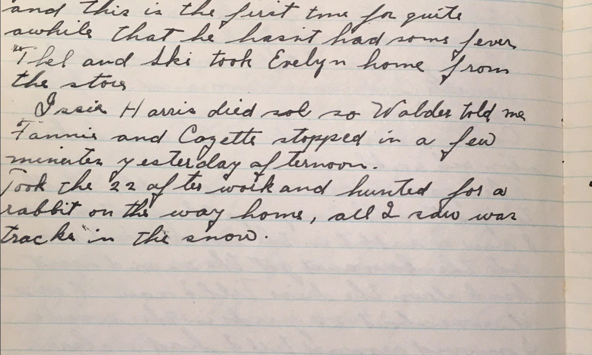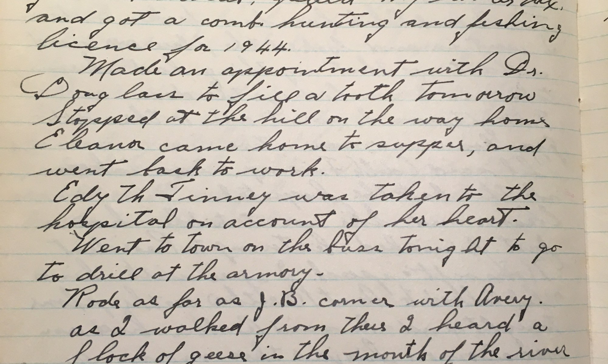 12th day – 354 days follow 26 Fair Thel $10.00 Fair and not too cold, wind West. Picked some ducks up on the hill this morning. After dinner I walked to town and got a haircut, paid my water tax, and got a combo hunting and fishing license for 1944. Made an appointment with Dr. …