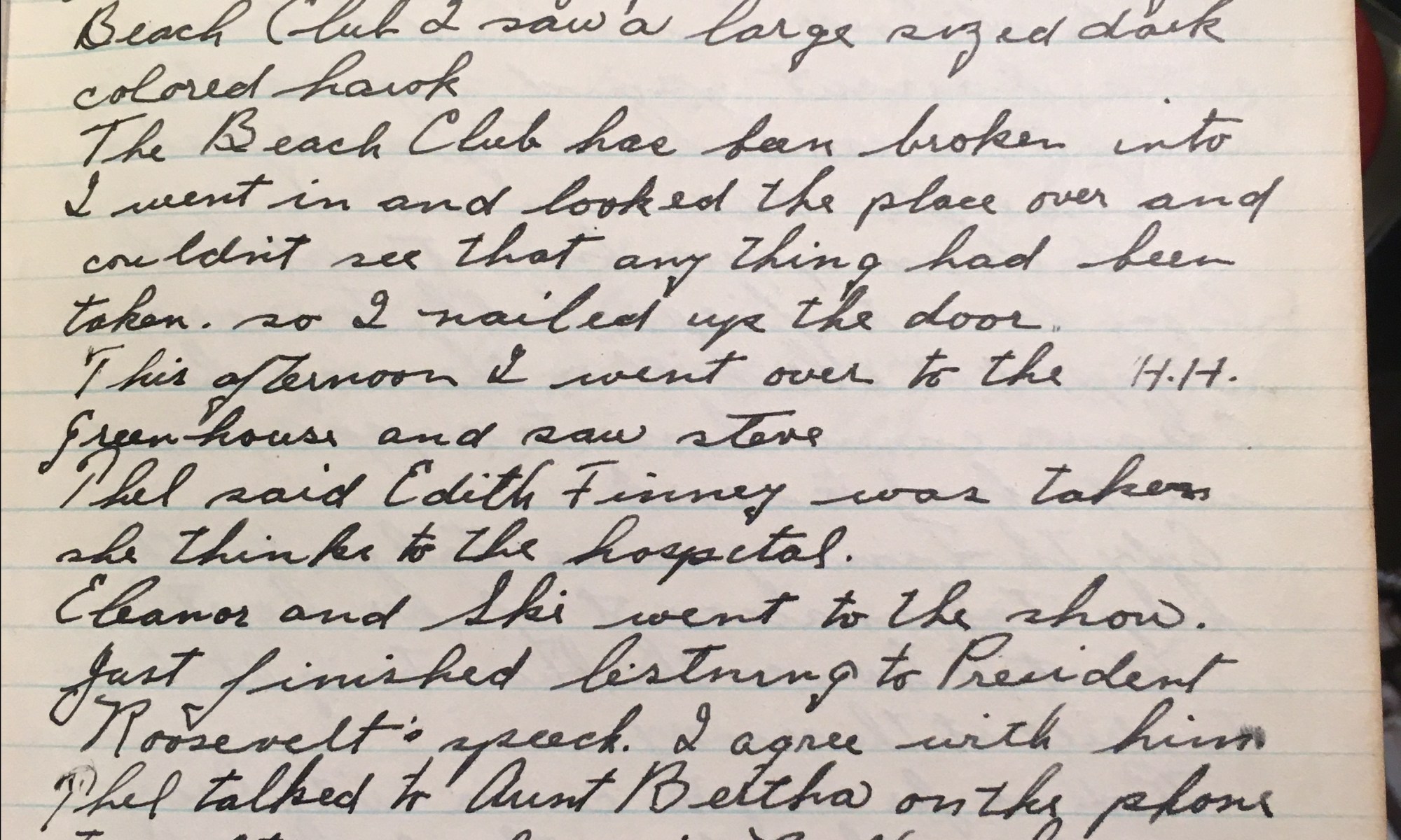 11th day – 355 days follow 12   Fair 16 Robins Wind changed today warmer So W. I saw a flock of 16 robins this morning and several blue jays, and down by the Beach Club I saw a large sized dark colored hawk. The Beach Club has been broken into. I went in and looked …