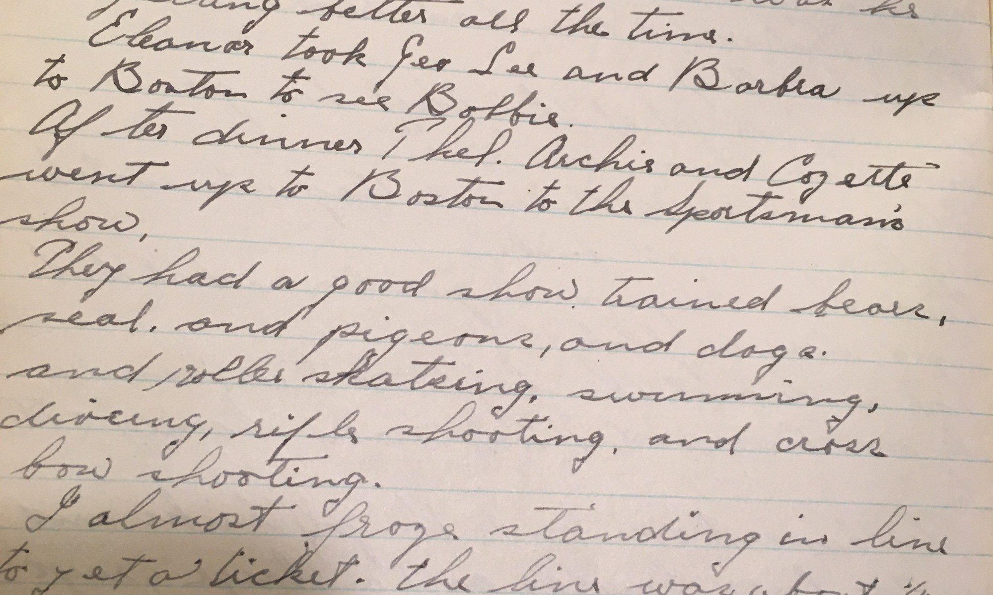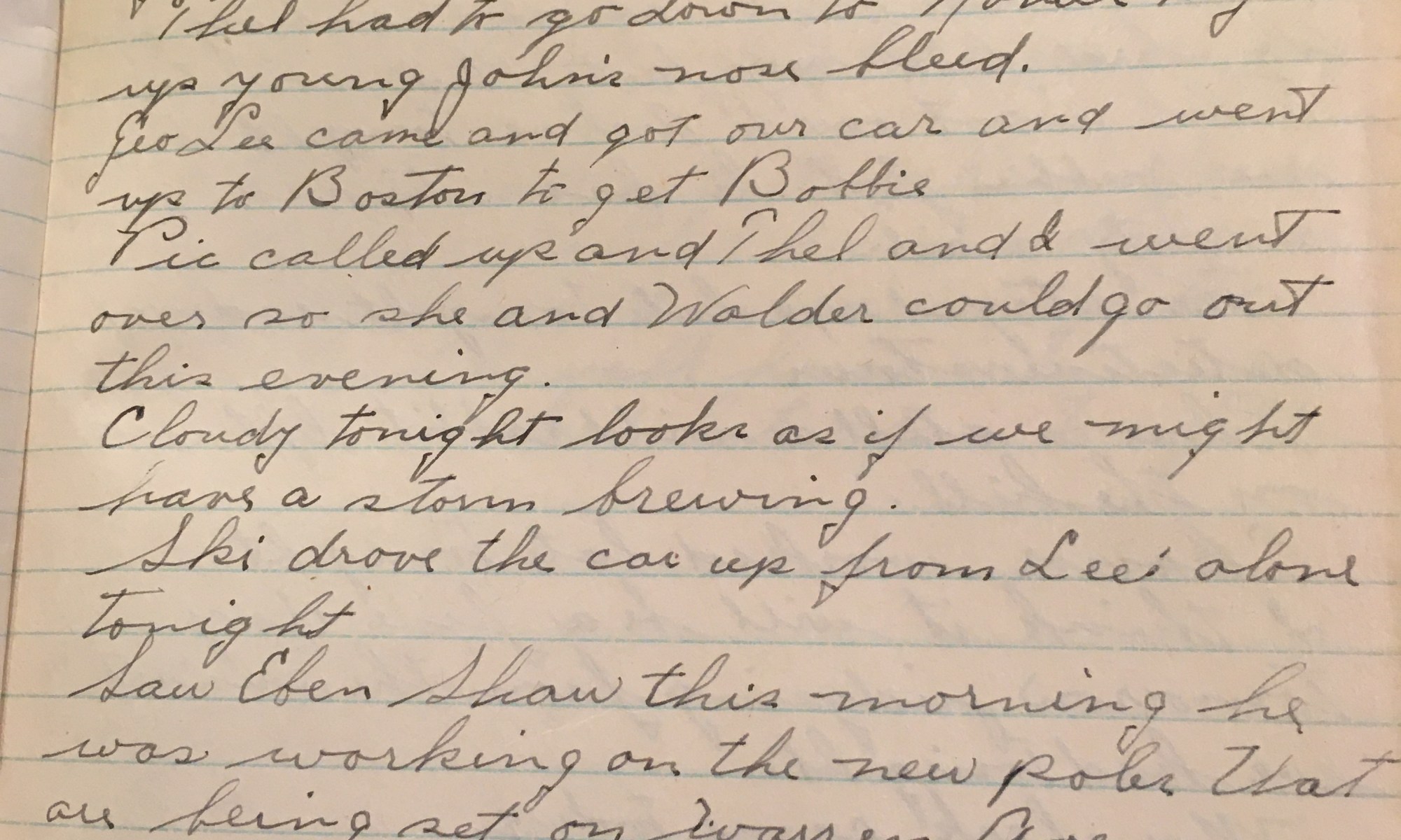 16th day – 350 days follow 30 Fair Went up on the hill this morning, Mr & Mrs H were there alone. Stopped in to see how Eric was, he is getting better all the time. Eleanor took Geo Lee and Barbra up to Boston to see Bobbie. After dinner, Thel, Archie, and Cozette went …