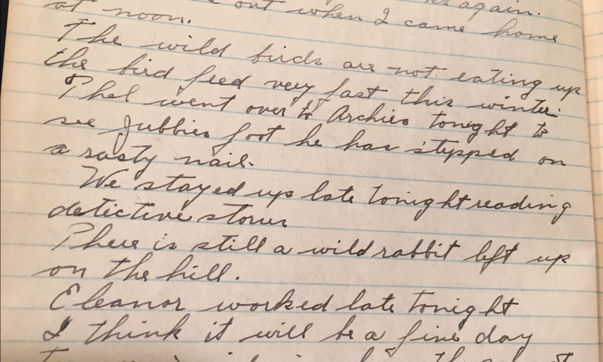 18th day – 348 days follow 32 Fair Wind So today and pretty fine. Saw one of the bug hawks again. Thel was out when I came home at noon. Th wild birds are not eating up the bird feed very fast this winter. Thel went over to Archie’s tonight to see Jubbie’s foot, he …