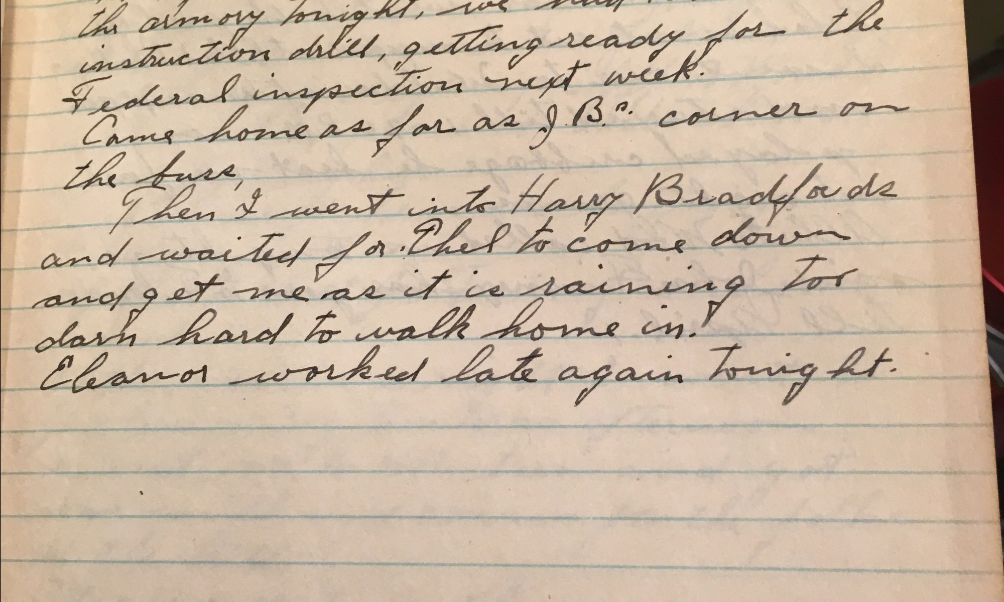 19th day – 347 days follow 35 cloudy Win So and warm and cloudy. Thel gave me a ride over to the Armory tonight, we had some instruction drill, getting ready for the Federal inspection next week. Came home as far as JB’s corner on the bus. Then I went into Harvy Bradford’s and waited …