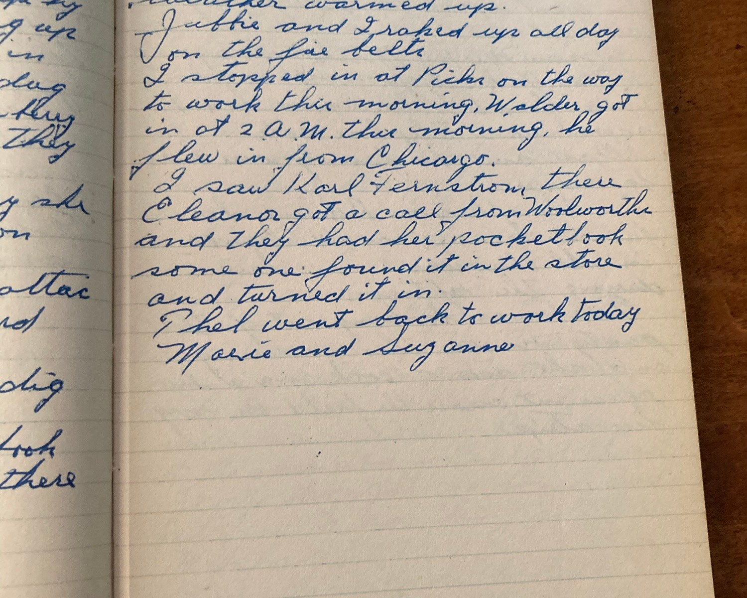 328th day- 37 days follow (Pheasants) Fair + Warmer Walder came + got me and we went up on the hill for my crosscut saw. I saw Mrs. H. + Martha who is going to New York City for several weeks. Came back to Walder’s and he + I sawed up a telephone pole. Dave …