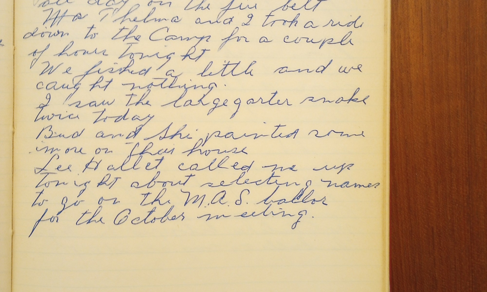253rd day- 113 days follow (Lee Hallet) Jubbie and I moved brush all day on the fire belt. Thelma and I took a ride down to the camp for a couple of hours tonight. We fished a little and we caught nothing. I saw the large garter snake twice today. Bud and Ski painted some …