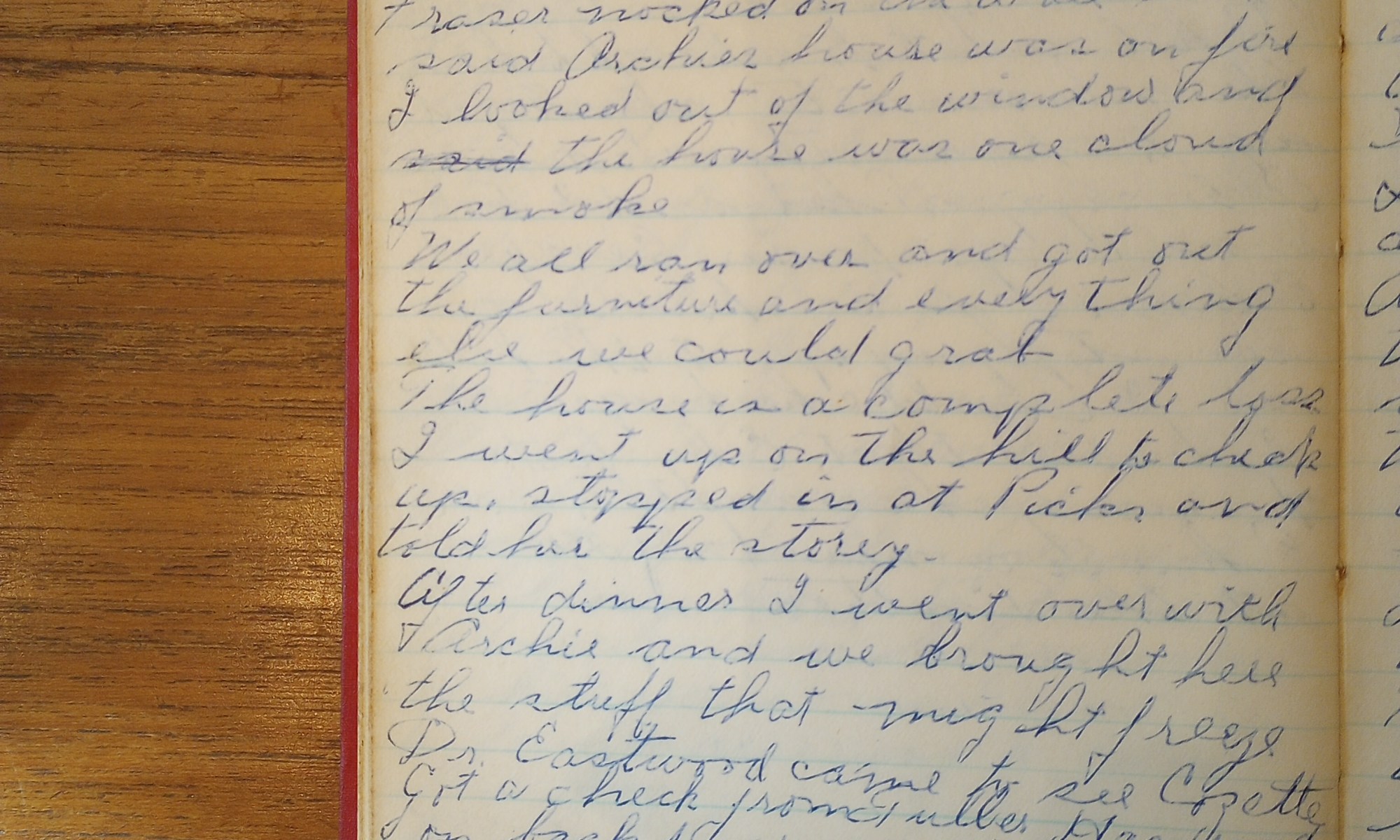 62nd day- 308 days follow “Archie’s fire” (Fuller Hammond) Cleared off fair. When we woke up this A.M. Dot Fraser knocked on the wall and said Archie’s house was on fire. I looked out of the window and the house was one cloud of smoke. We all ran over and got out the furniture and …
