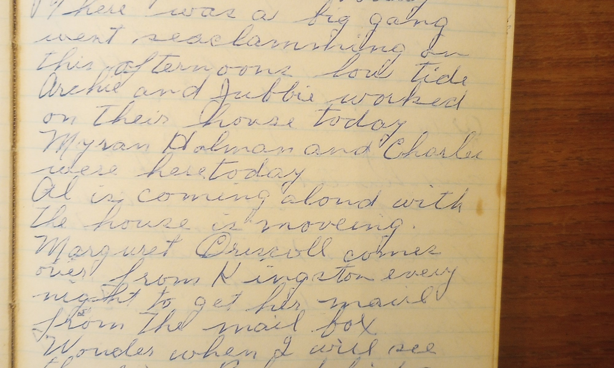 65th day- 300 days follow Fair and warmer. Good day to work today. There was a big gang went seaclamming on this afternoon’s low tide. Archie and Jubbie worked on their house today. Myran Holman and Charles were here today. Al is coming along with the house, is moving. Margaret Driscoll comes over from Kingston …