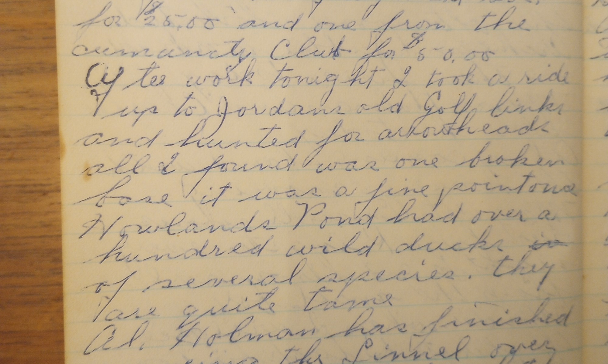 66th day- 299 days follow Fair + warmer. Trimmed trees and shrubbery on around the Horse green. Arche got two donations today one from the Fragment Society for $25.00 and one from the Community Club for $50.00. After work tonight I took a ride up to Jordan’s old golf links and hunted for arrowheads. All …