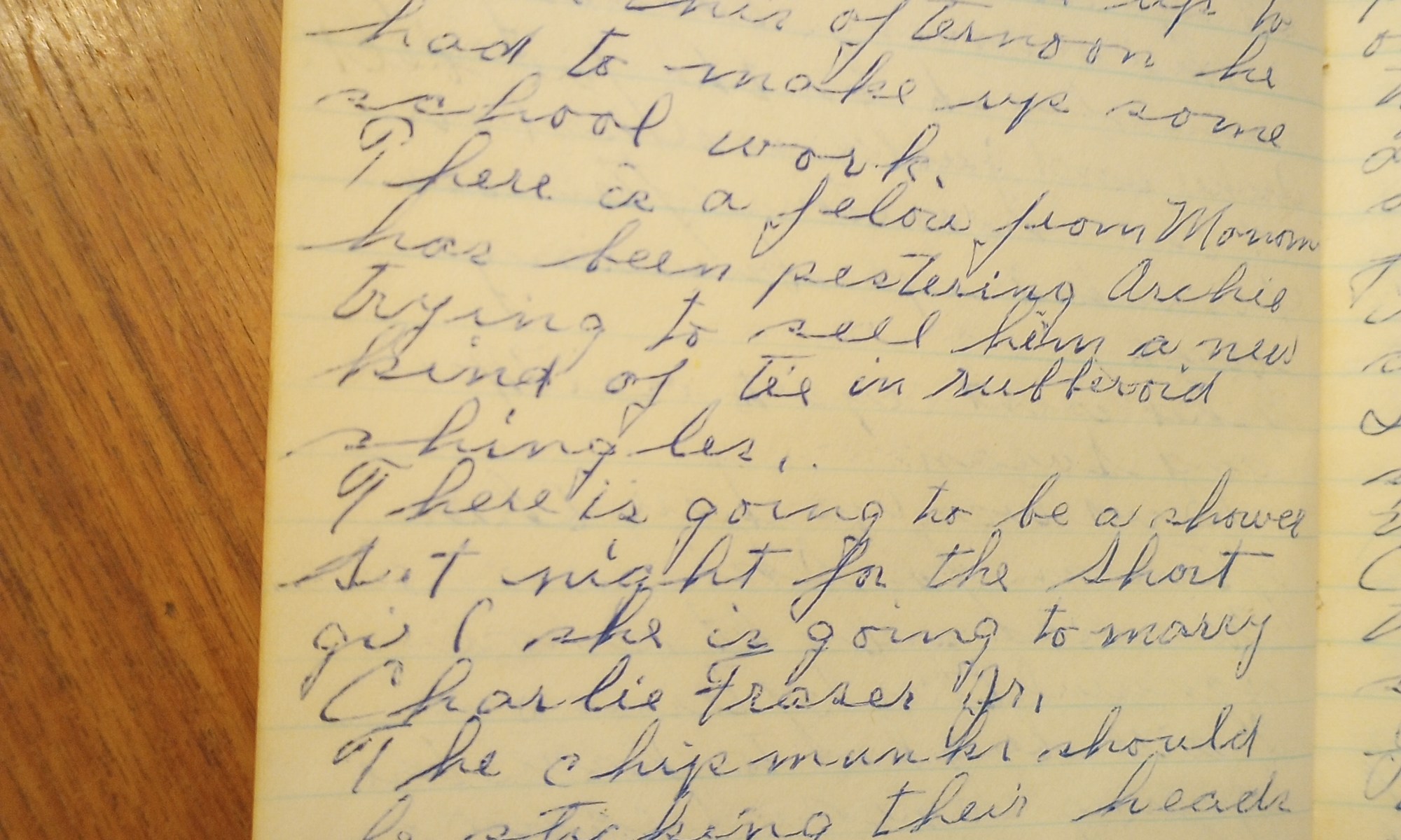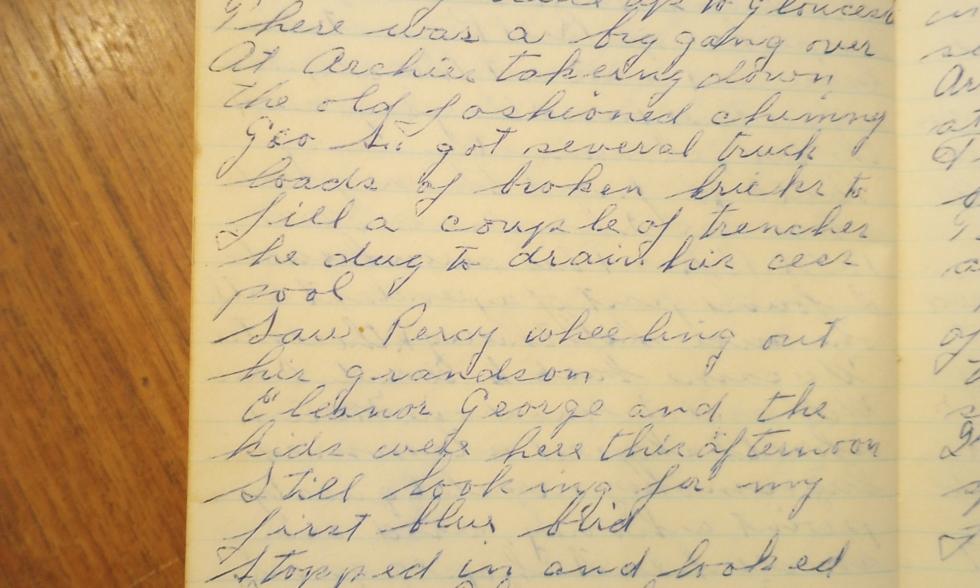 68th day- 297 days follow Fair + mild. Checked on the house on the hill, stopped in at Pick’s on the way home, they were taking Alice up to Gloucester. There was a big gang over at Archie’s taking down the old fashioned chimney. George S. got several truck loads of broken bricks to fill …