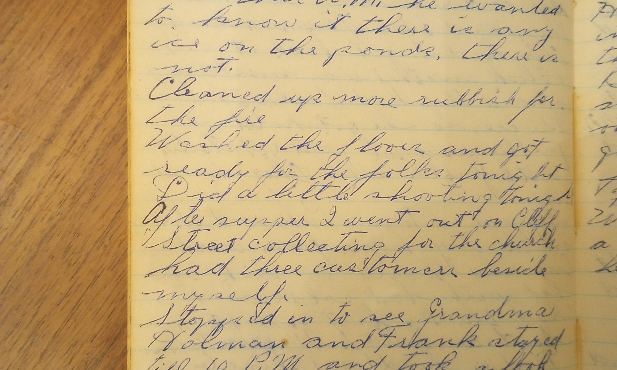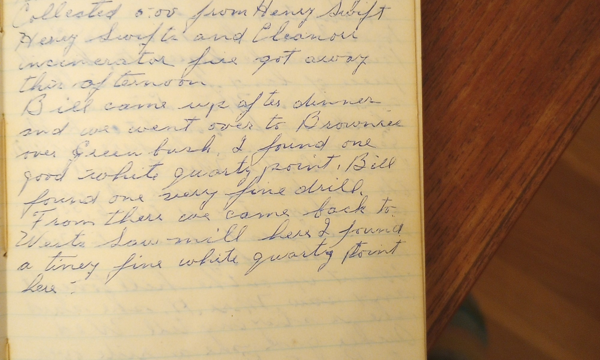 25th day- 340 days follow (Arrowheads) Raked up more rubbish. Geo Crowell was up on the hill. Thel and I shot some today. Collected $5.00 from Henry Swift. Henry Swift’s and Eleanor’s incinerator fire got away this afternoon. Bill came up after dinner and we went over to Brownies over Greenbush. I found one good …