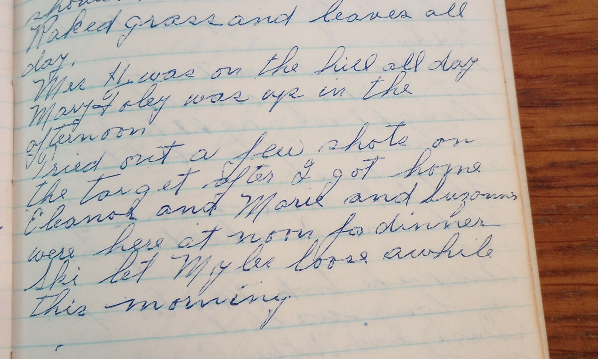 27th day- 338 days follow Wind north, but warm, some showers. Raked grass and leaves all day. Mrs. H. was on the hill all day. Mary Foley was up in the afternoon. Tried out a few shots on the target after I got home. Eleanor and Marie and Suzanne were here at noon for dinner. …