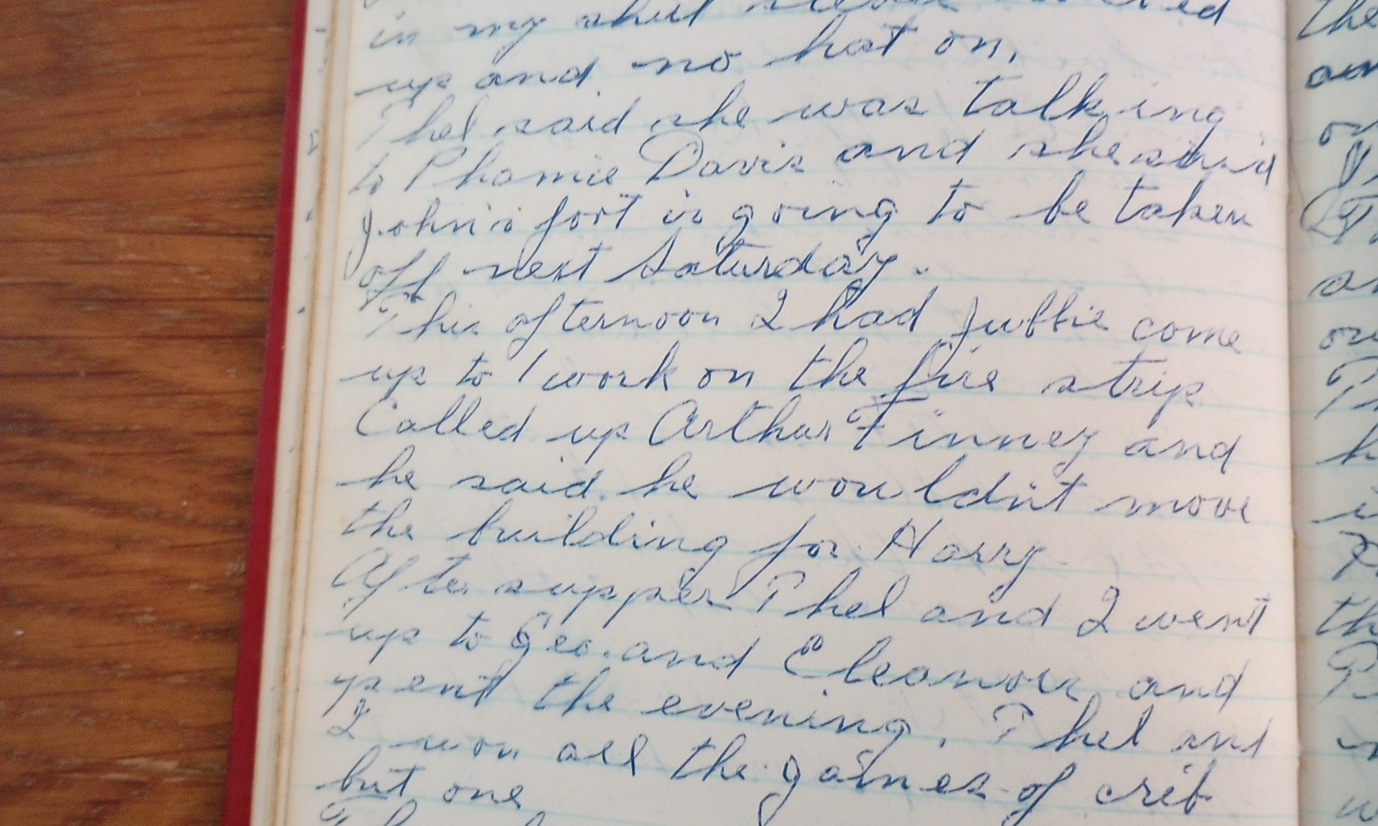 30th day- 335 days follow (Jubbie) Foggy and warm. Cut brush in back of Maraghy’s on the proposed fire belt. It was so warm I worked in my shirt sleeves rolled up and no hat on.. Thel said she was talking to Phamie Davis and she said John’s foot is going to be taken off …