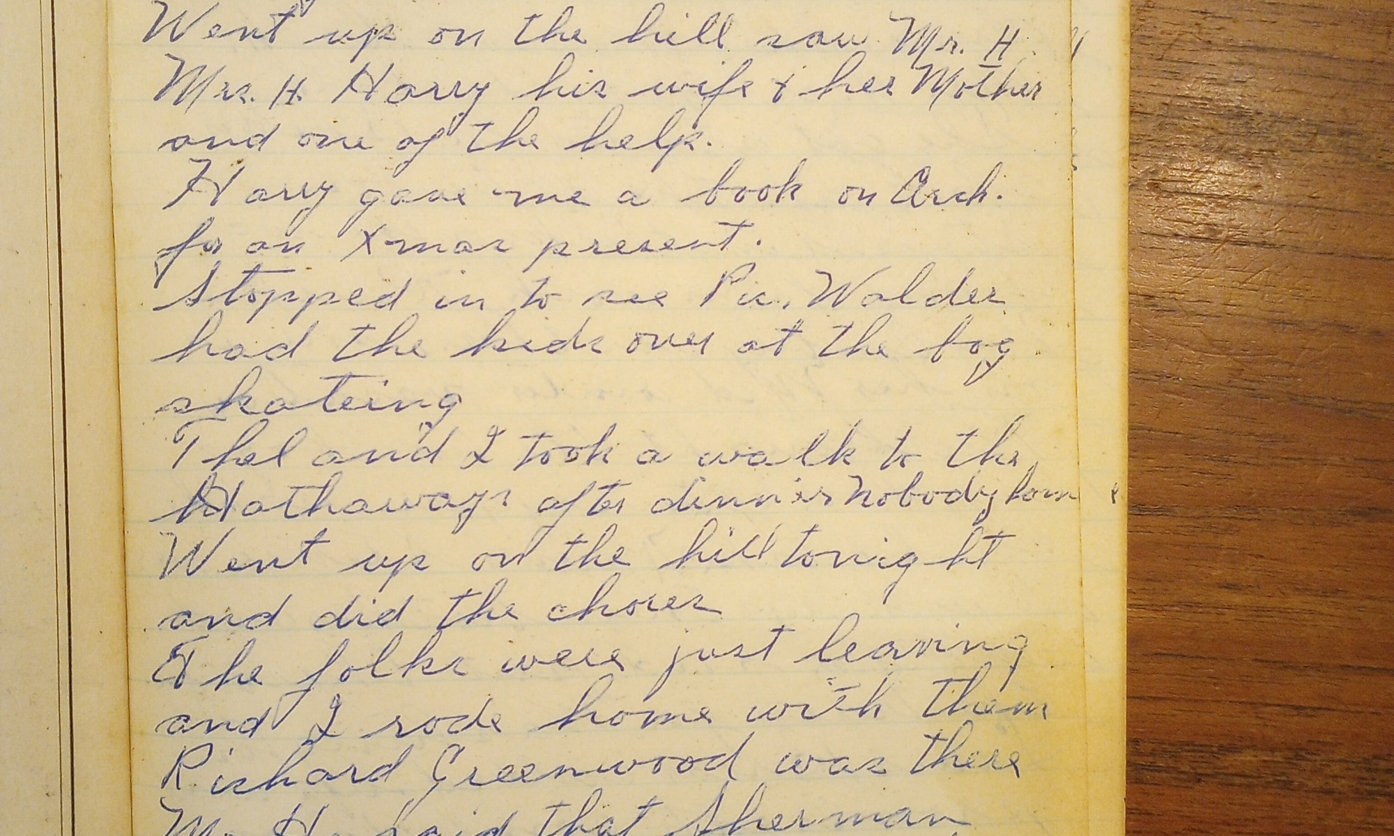 1st day- 364 days follow New Year’s Day Snow flurries and cold. Went up on the hill saw Mr. H., Mrs. H., Harry, his wife and her mother and one of the help. Harry gave me a book on Arch. for an Xmas present. Stopped in to see Pic. Walder had the kids over at …