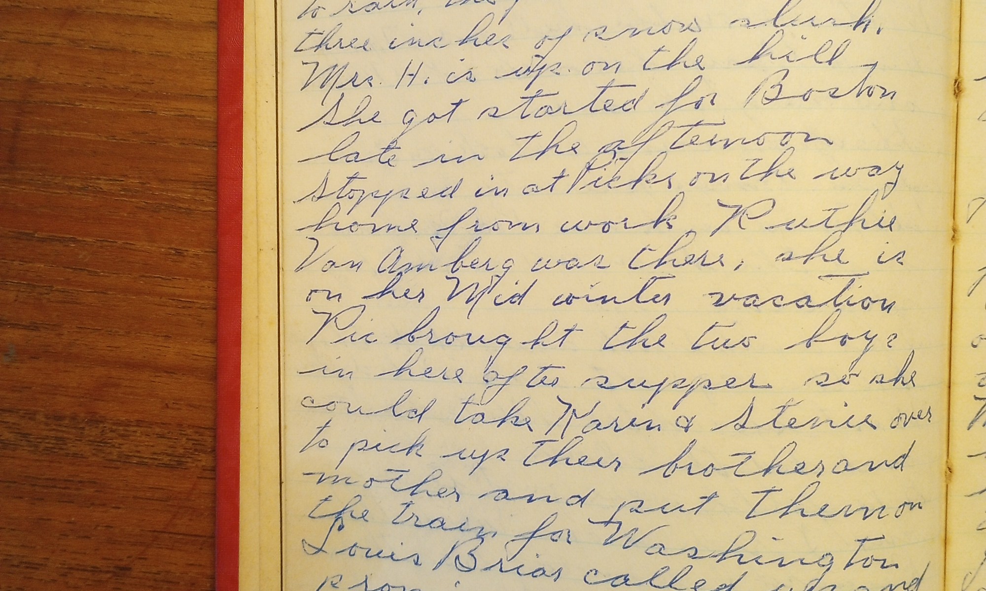 2nd day- 363 days follow Snowed hard last night turning to rain. The ground has about three inches of snow slush. Mrs. H. is up on the hill. She got started for Boston late in the afternoon. Stopped in at Pick’s on the way home from work. Ruthie Van Amberg was there, she is on …