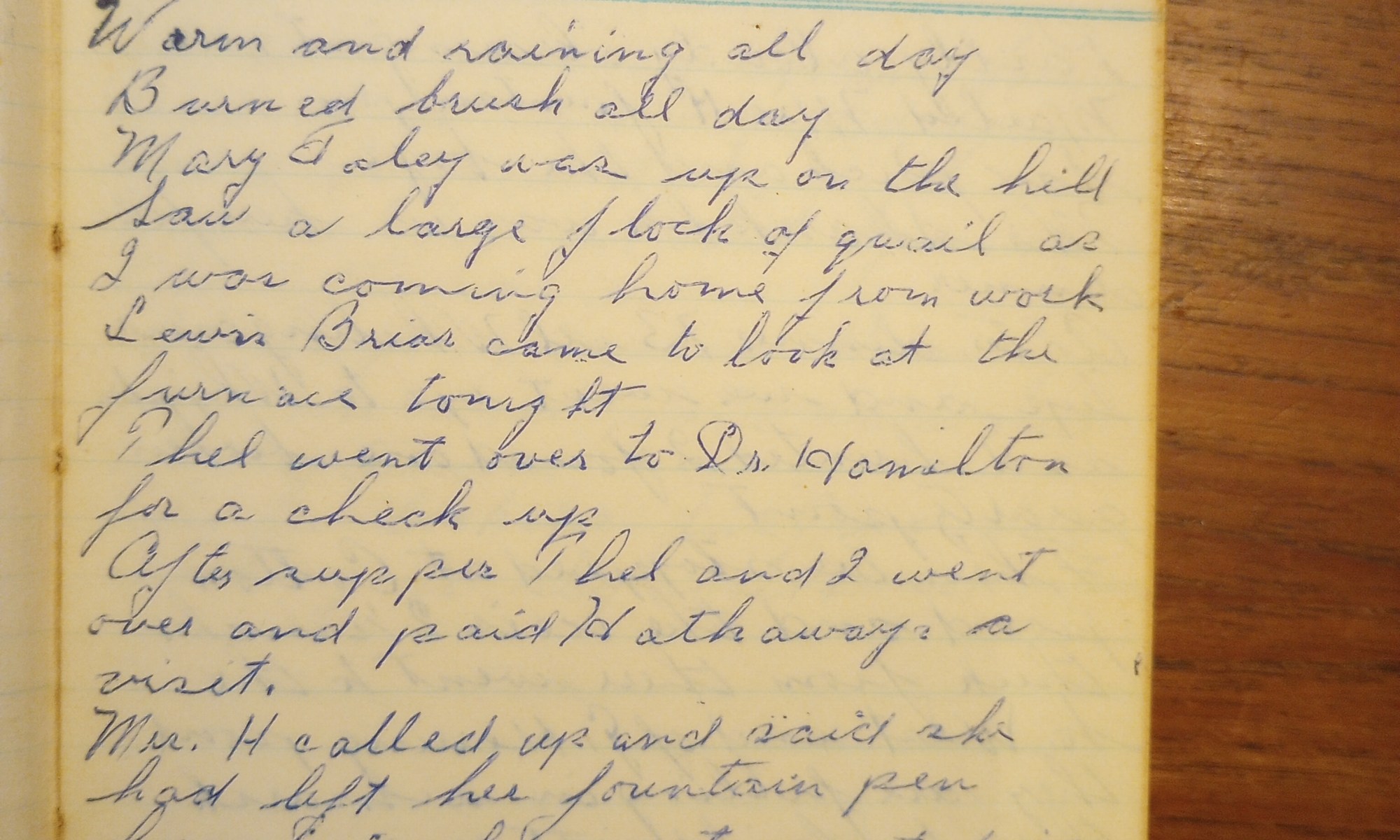 3rd day- 362 days follow (Quail) Warm and raining all day. Burned brush all day. Mary Foley was up on the hill. Saw a large flock of quail as I was coming home from work. Les Briar came to look at the furnace tonight. Thel went over to Dr. Hamilton for a check up. After …