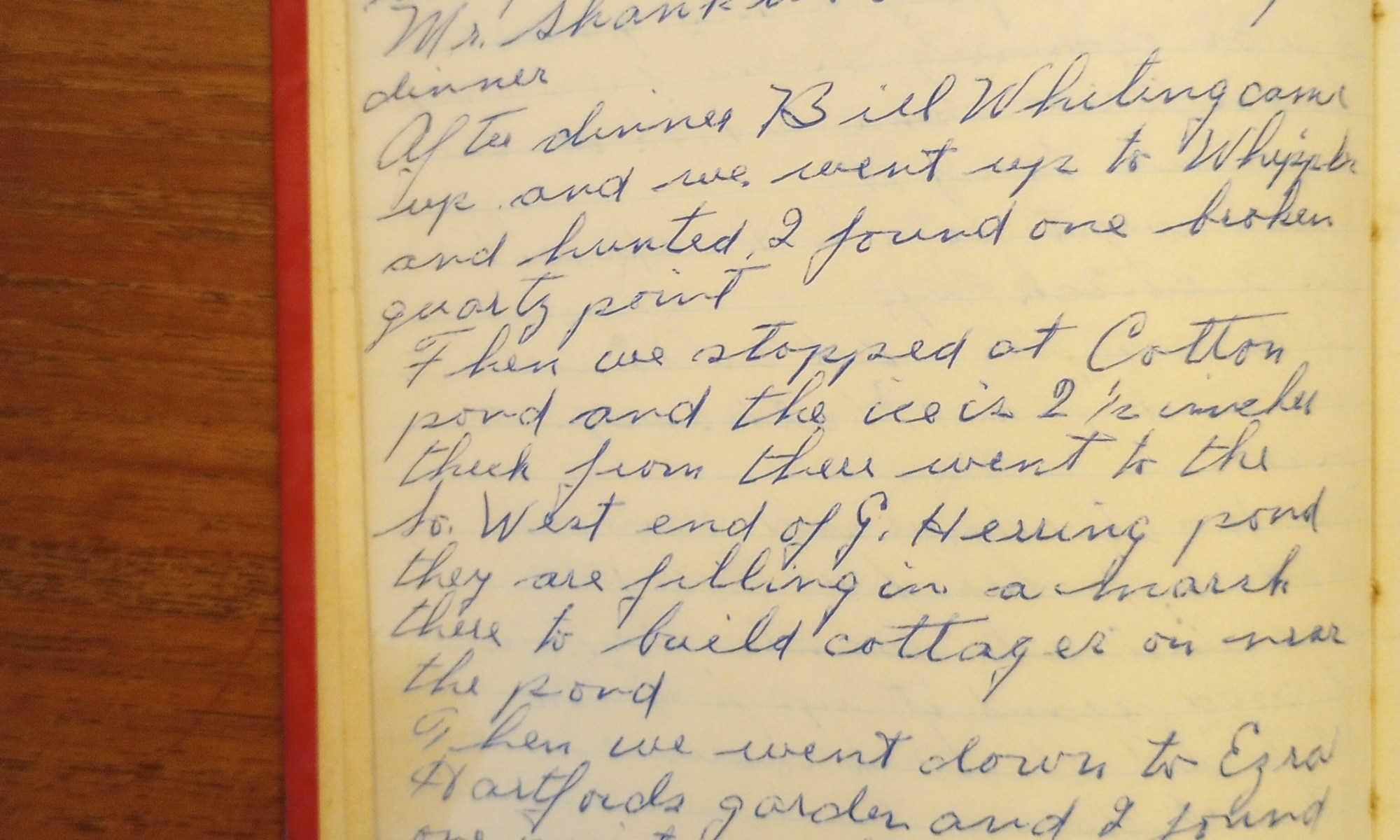 4th day- 361 days follow (Arrowheads) Partly cloudy clearing at noon. Mailed Mrs. H’s fountain pen. Saw Pick and the boys. Mr. Shanklin was in here for dinner. After dinner Bill Whiting came up and we went up to Whipple’s and hunted. I found one broken quartz point. Then we stopped at Cotton Pond and …