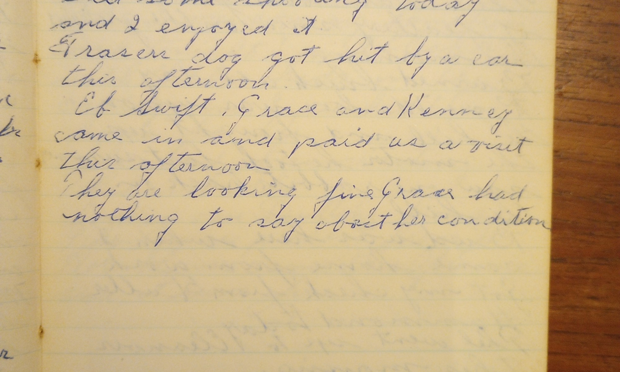 5th day- 360 days follow Cold early warmed up and fair. Did some shooting today and I enjoyed it. Fraser’s dog got hit by a car this afternoon. Ed Swift, Grace and Kenney came in and paid us a visit this afternoon. They are looking fine. Grace had nothing to say about her condition.
