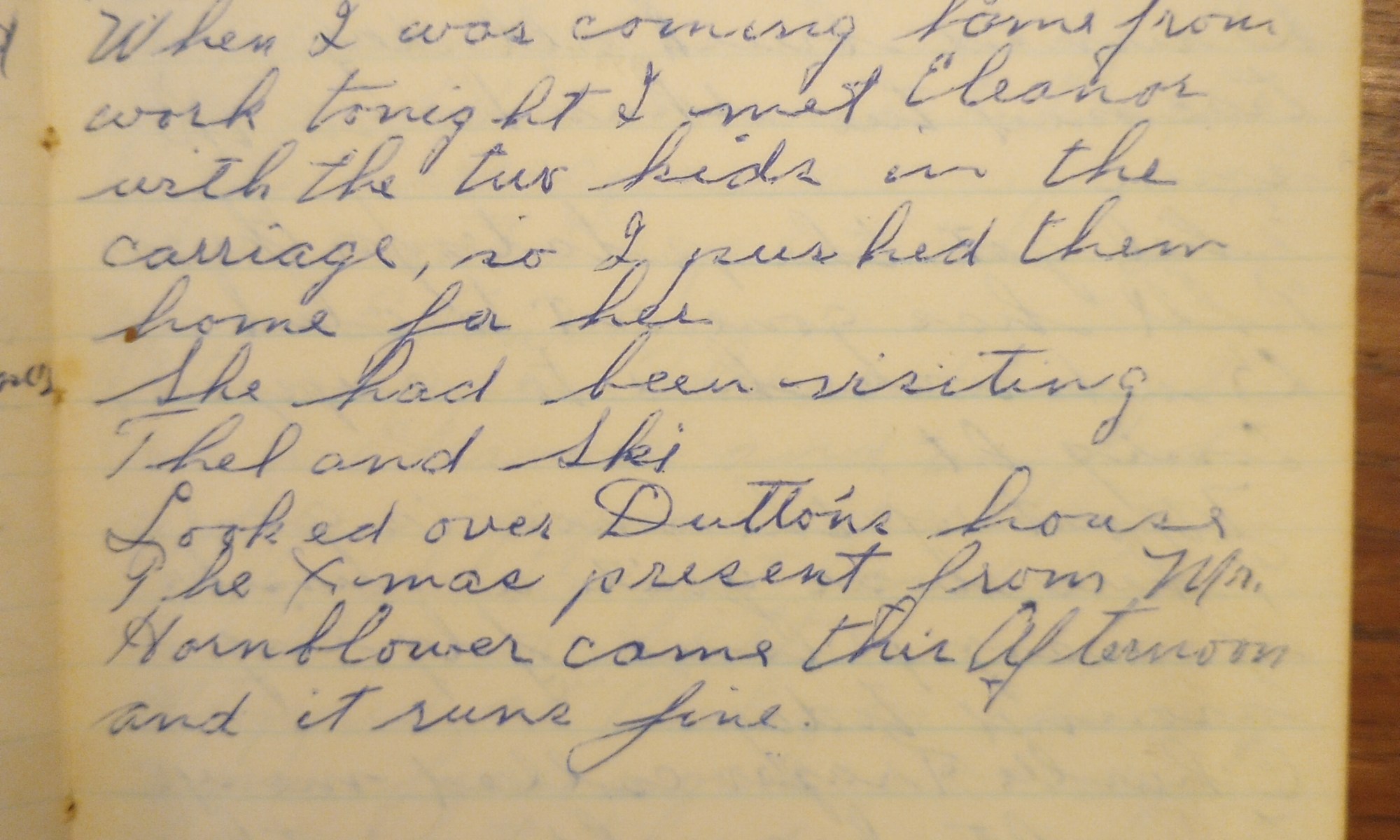 7th day- 358 days follow Radio Warmer wind so thawing. Burned brush all day. When I was coming home from work tonight I met Eleanor with the two kids in the carriage, so I pushed them home for her. She had been visiting Thel and Ski. Looked over Dutton’s house. The Xmas present from Mr. …